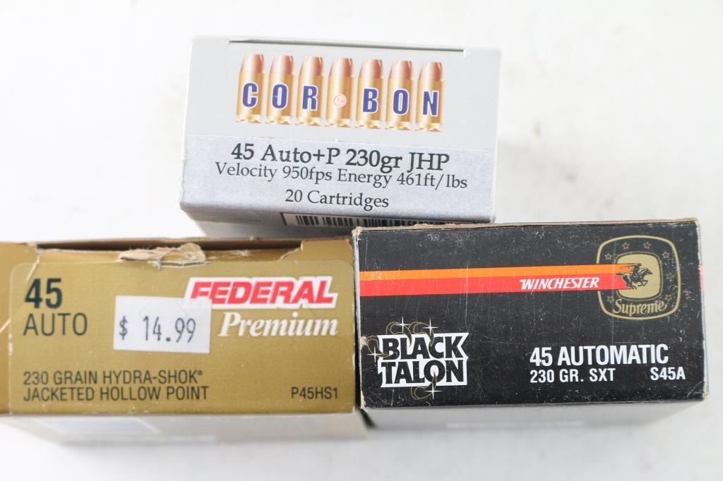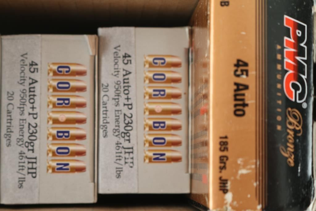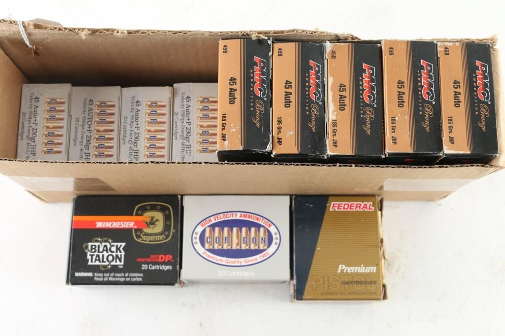 Approx. 390 rounds of factory new 45 ACP ammunition. PMC, Corbon & others. All in factory boxes.