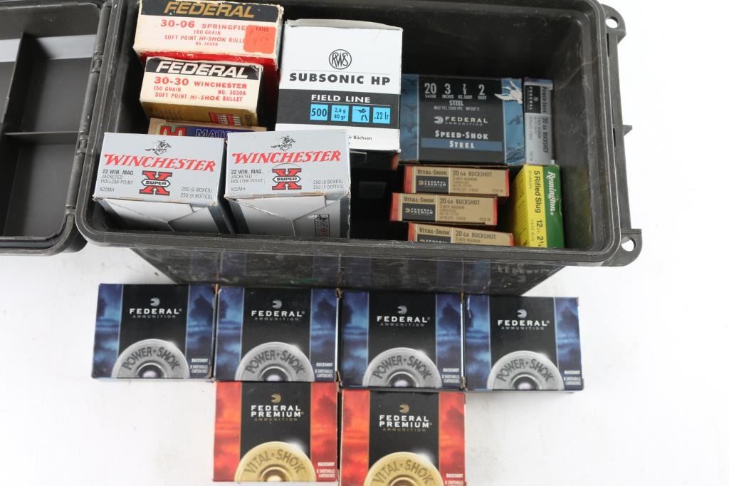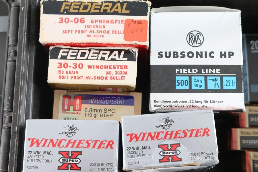 Approx. 1140 rounds total. approx. 500 rnds of 22 LR, approx. 500 rnds of 22 win mag, approx. 20 rnds each of 30-06/30-30/6.8 SPC, approx. 75 rnds of 20 Gauge & approx 5 rnds of 12 Gauge shotshells.