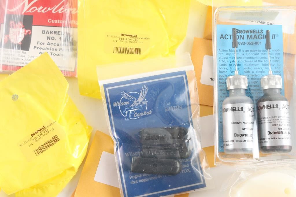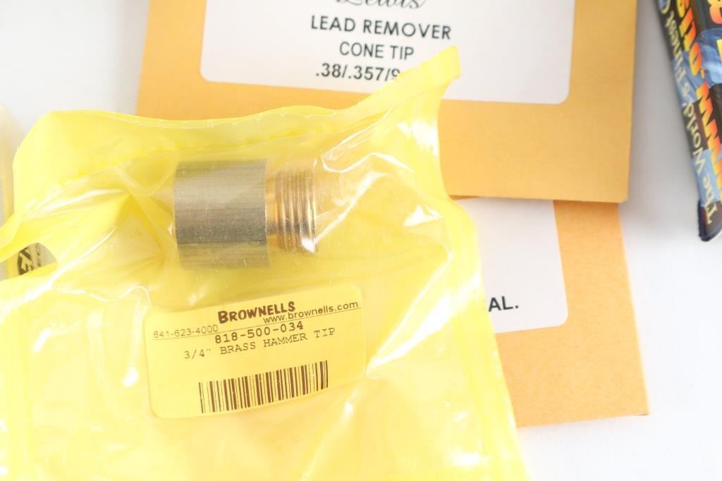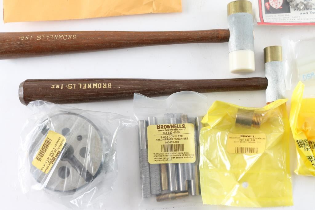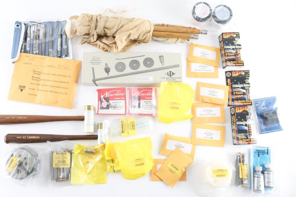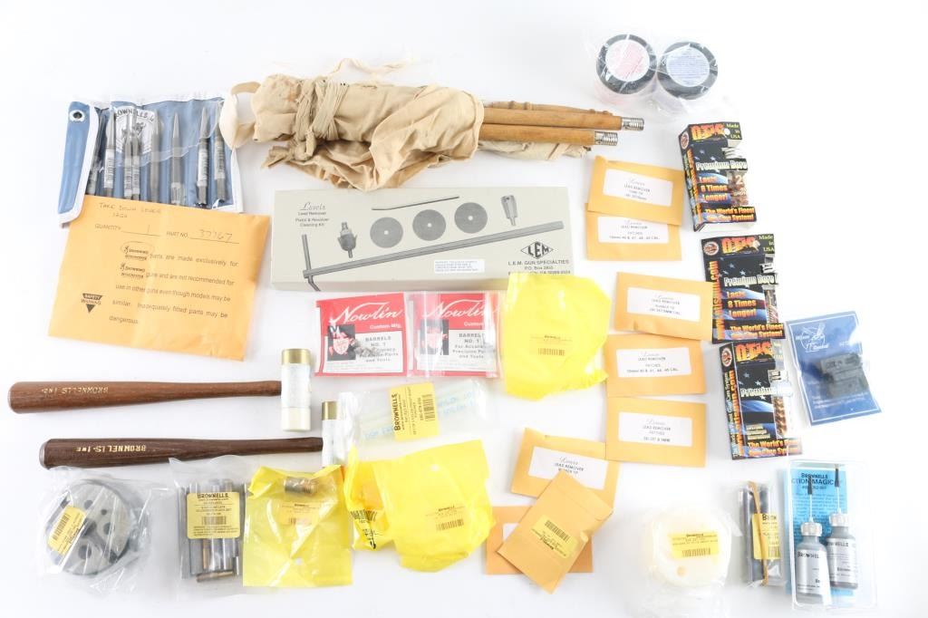 Includes multiple types of Brownell's punch sets, from nylon to brass & brass/ plastic head hammers; sets of Outters & others cleaning rods, from .22 Cal to shotgun; cleaning compound and Brownell's action lube; Otis brass bore brushes, different sizes; Brownell's hammer/sear file & stone kit & a few misc. gun parts.