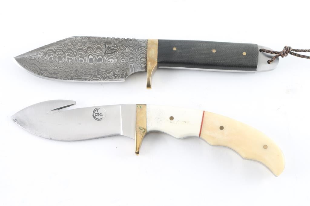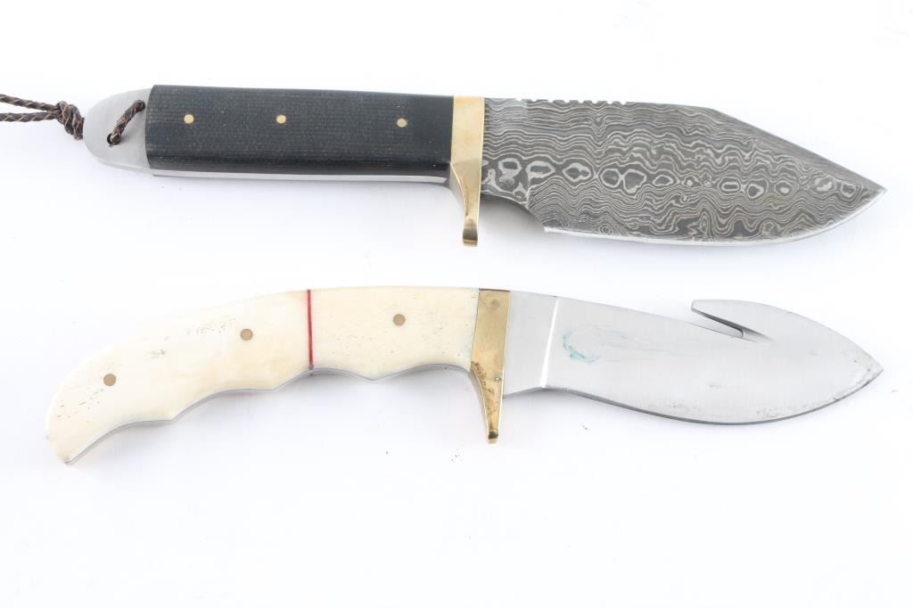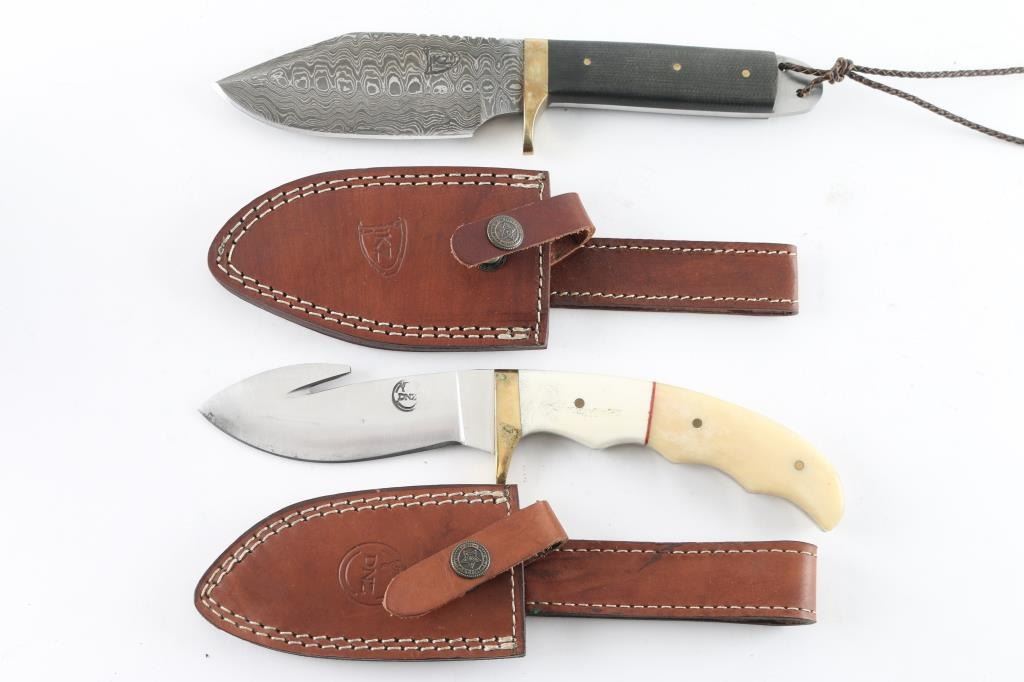 1) Skinning knife with 4 1/2" Damascus blade, G10 grips and brass guard. 2) Gutting knife with 4 1/4" polished blade, bone grips and brass guard. Both with hardly worn brown leather sheaths. Good to very good condition.