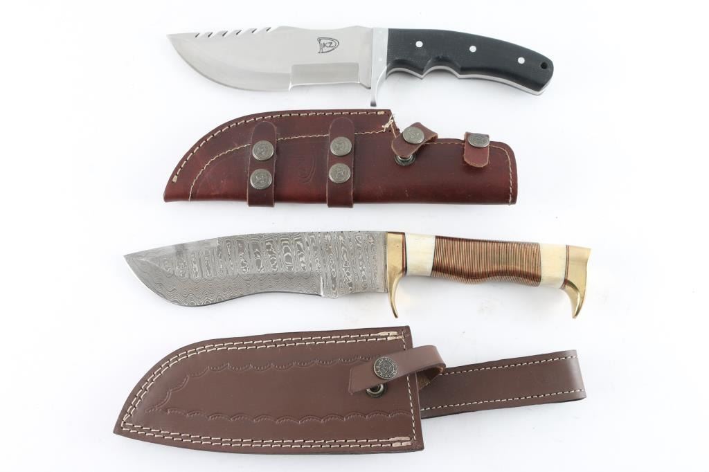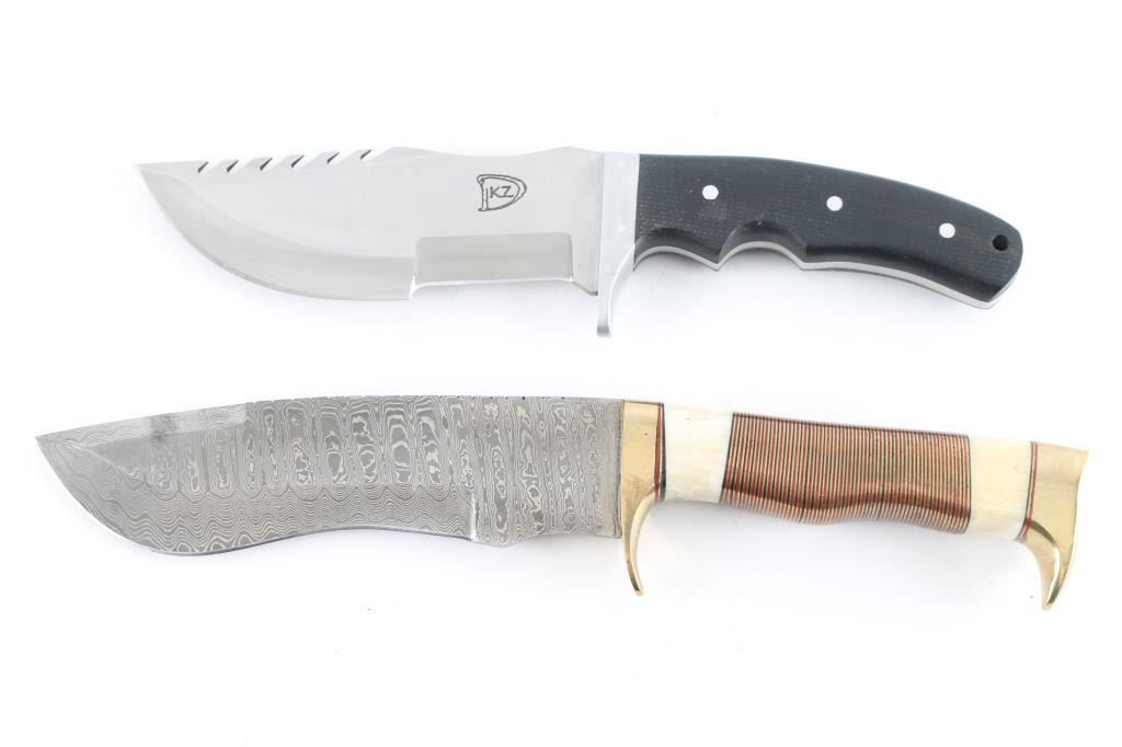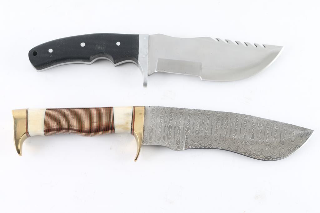 1) Recurve/universal with a 5 1/2" Damascus blade, brass guard and butt with bone, red/black/brass wire inlay handles. 2) Universal/hunting/bushcraft with a 5 1/2" polished blade, steel guard and G10 grips.