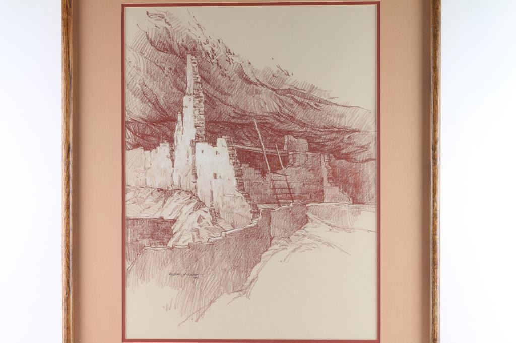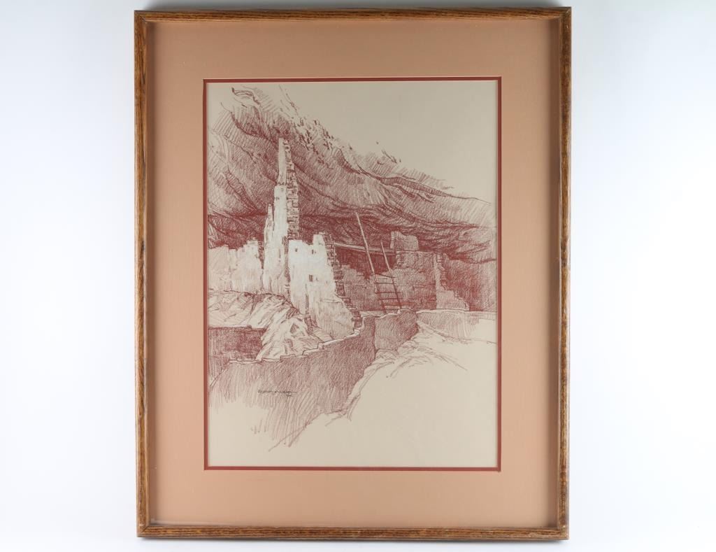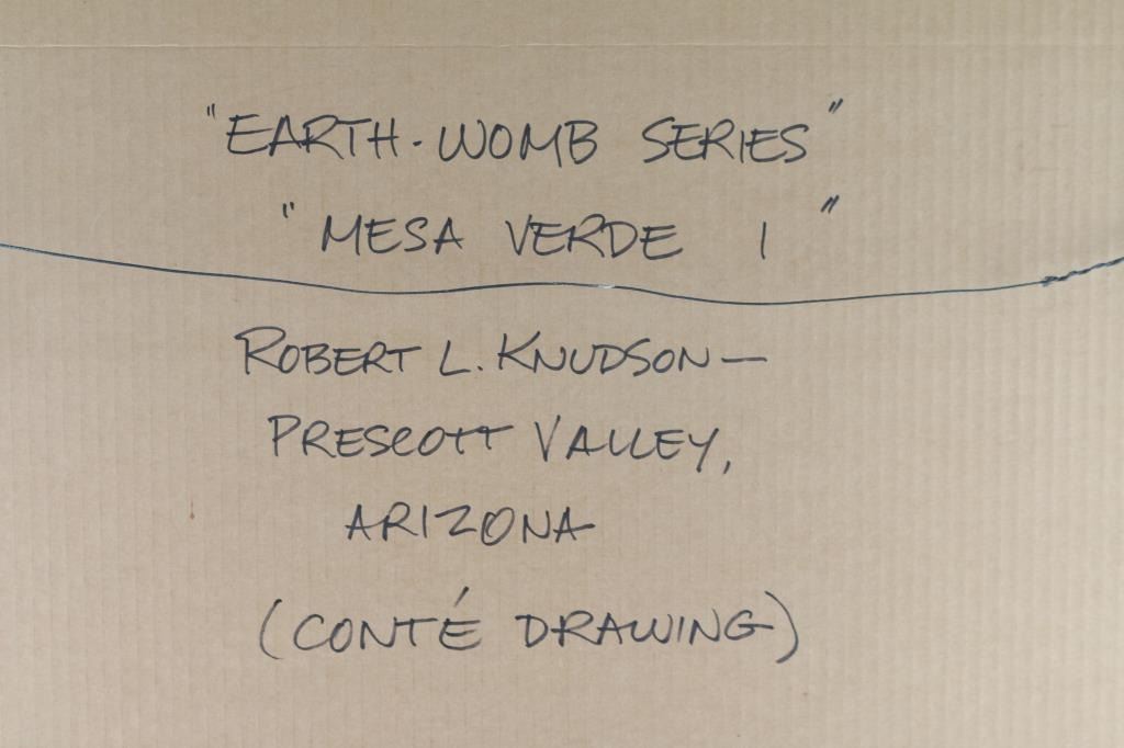 by Prescott Valley artist, Robert L. Knudson, entitled, "Earth Womb" Series, Mesa Verde #1. Double matted and framed, measures 18x24"long. The work of Bob Knudson is represented in major collections through out the US including the William Penn Memorial Museum amd the Museum of Northern AZ. His painting frequently appear in Arizona Highways and he has been member of the Mountain Oyster Club the oldest and most prestigious cattleman's club in the Southwest.