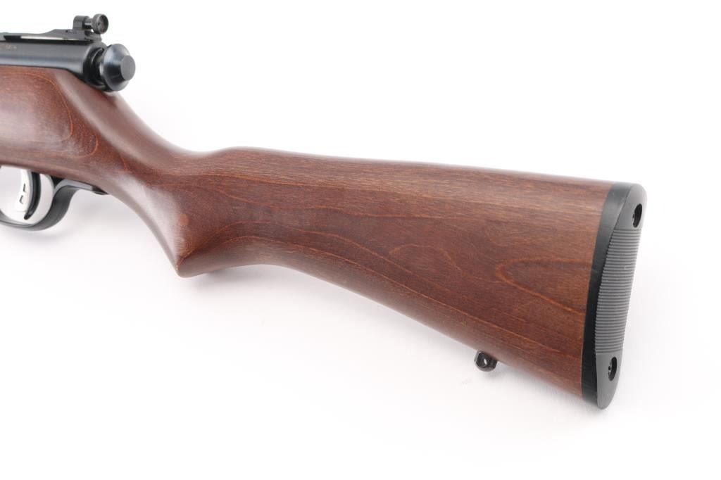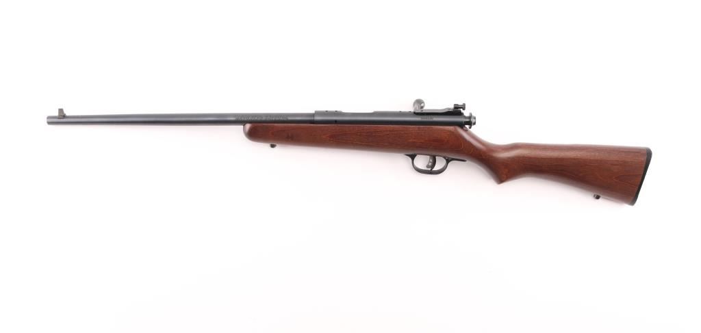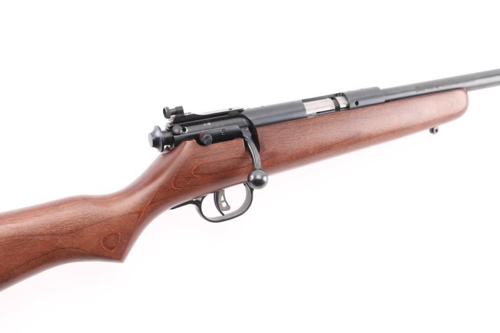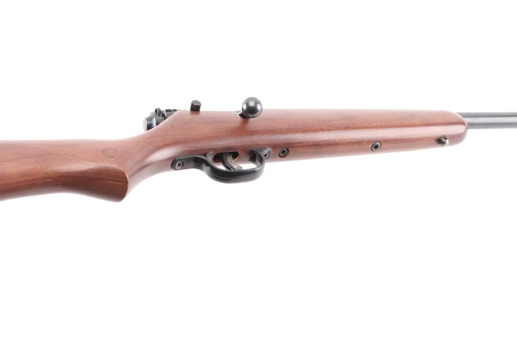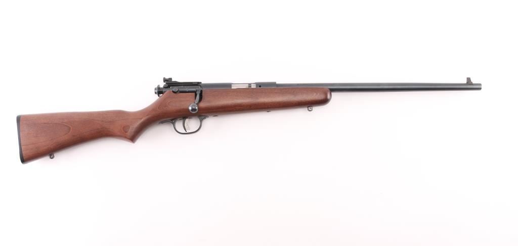 Savage Cub single-shot bolt-action youth rimfire rifle .22 S/L/LR Rifle caliber. 16" button-rifled barrel 1 in 16" twist. Adjustable AccuTrigger. Traditional safety. Walnut-stained laminate stock. Rear peep sight Blued barrel. 36" overall length. 3.5 lbs. Receiver drilled/tapped for optics, no filler screws. Sling swivel studs. Bore is excellent/bright. Wood & metal finish are excellent. Like new. NRA Condition-Excellent. Modern firearm.