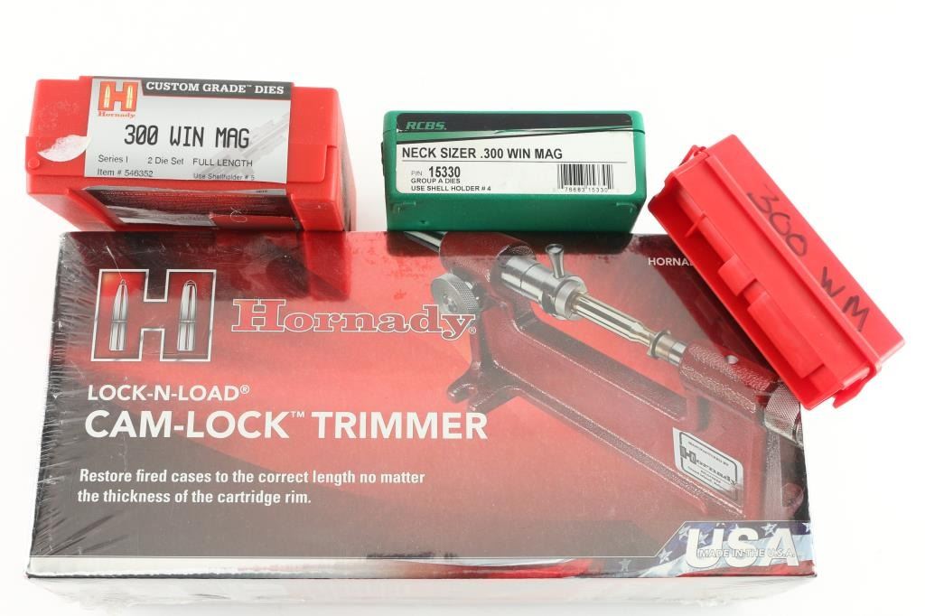 1) Lee Precision .300 Win. Mag, Collet Neck sizing Die in case. 2) Hornady .300 Win. Mag. full length 2 die set. In Case (shell holder #5) 3) RCBS .300 Win Mag. Neck sizer (Shell Holder #4) In case. 4) Hornady Cam-Lock Trimmer, New in box.