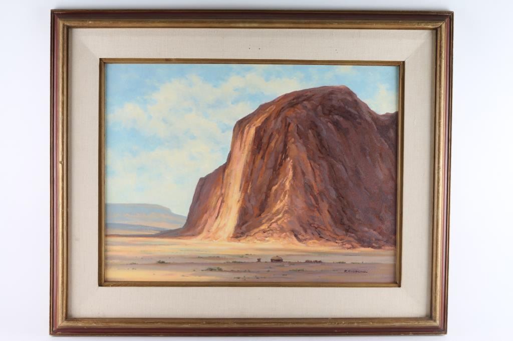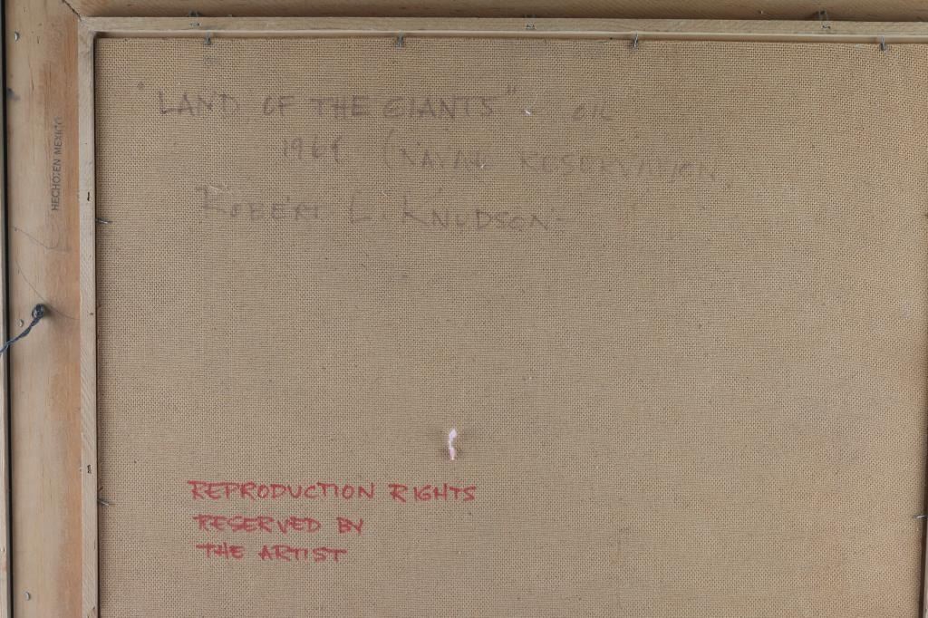 by Prescott Valley artist, Robert Knudson, called "Land of the Giants", hand-signed lower right, measures 24x18". The work of Bob Knudson is represented in major collections through out the US including the William Penn Memorial Museum amd the Museum of Northern AZ. His painting frequently appear in Arizona Highways and he has been member of the Mountain Oyster Club the oldest and most prestigious cattleman's club in the Southwest.