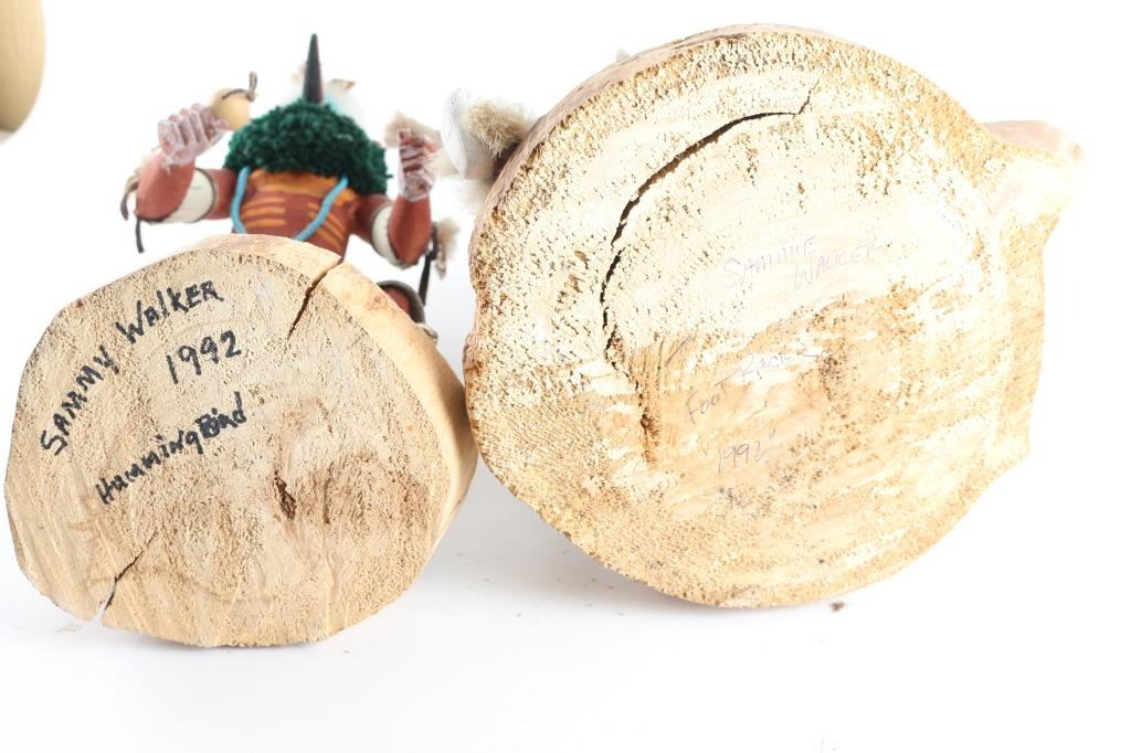 Handsigned by master carver, Sammie Walker: (1) Hummingbird - 1992, approx 20" high x 7" dia base (2) Foot Racer - 1992, approx 16" high x 11" dia base
