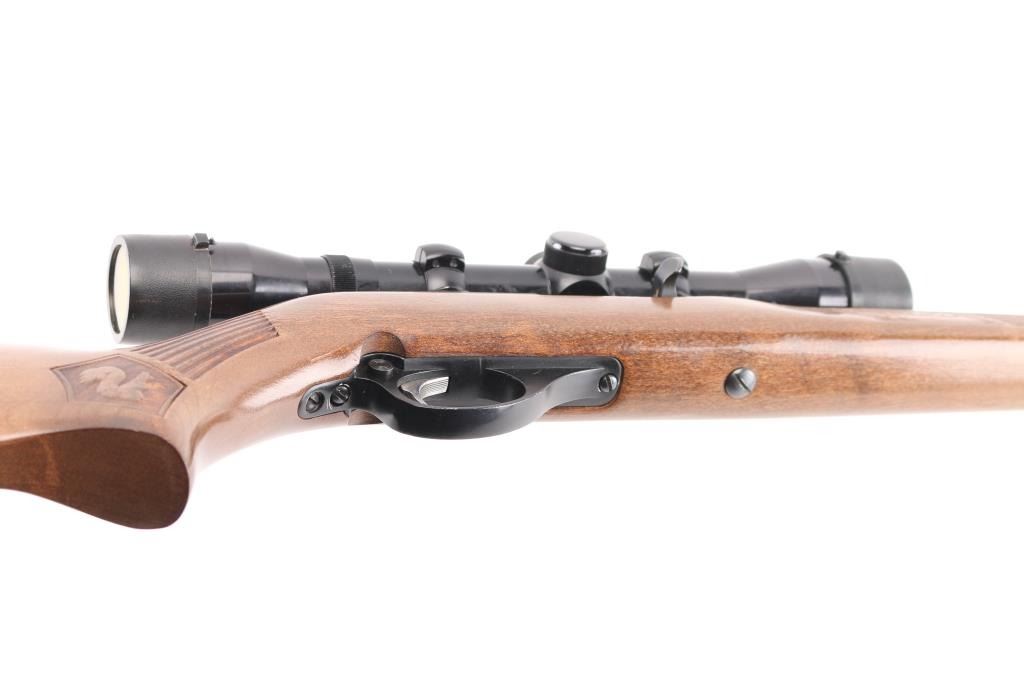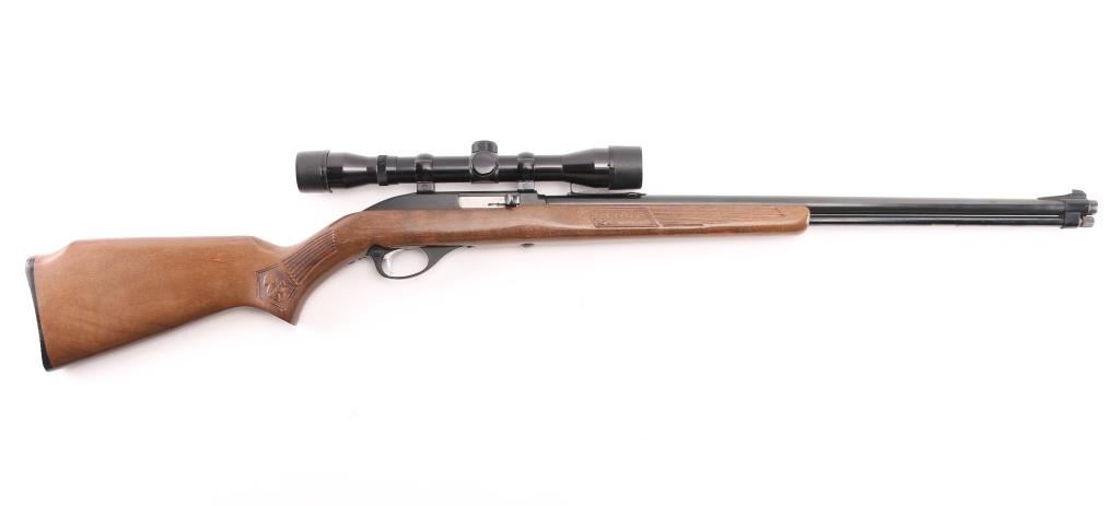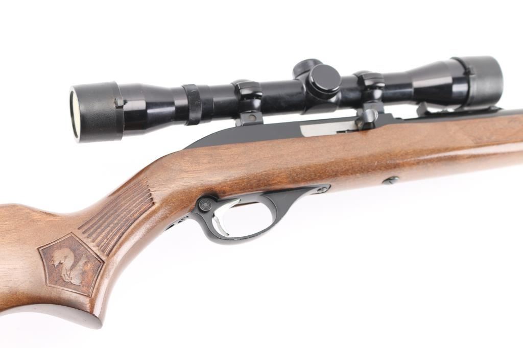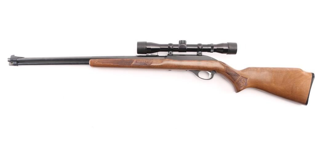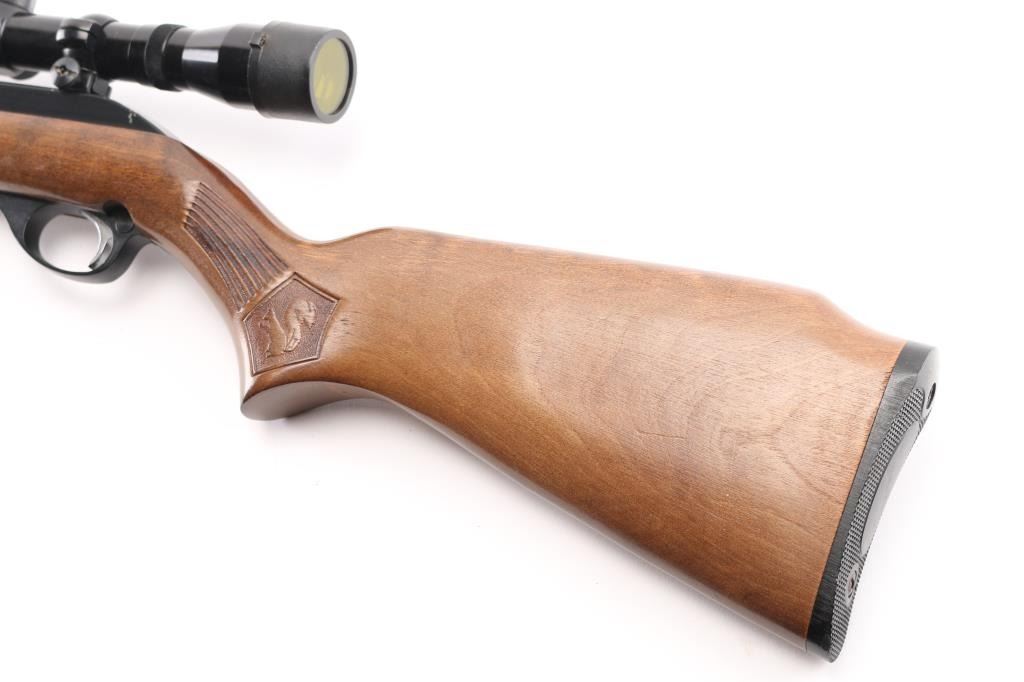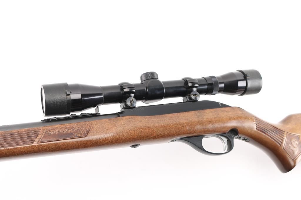 Semiautomatic rimfire rifle for 22 long rifle only. Features blued finish, black finished aluminum allot receiver & triggerguard, wood stock with impressed narrow grasping grooves and decorations, black plastic buttplate, 22" barrel, full length magazine tube under barrel, blade front & sporting rear sights, grooved receiver, manual bolt hold open, push button safety. Bore is very good condition. Retains 90% finish with edge losses, scratches on receiver. Stock is very good with minor blemishes, tiny chip from edge of buttplate. Mounts an older Japanese made Tasco 4x32mm scope with fine crosshairs, clear view. Condition is NRA Very Good++ *** Modern Firearm ***