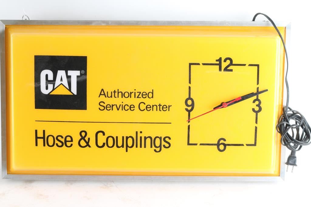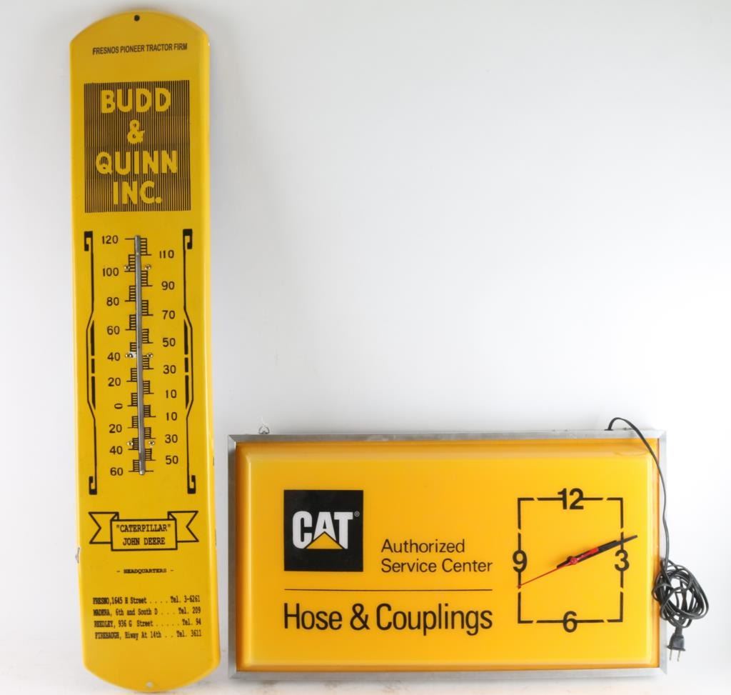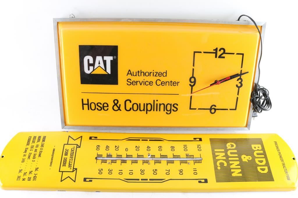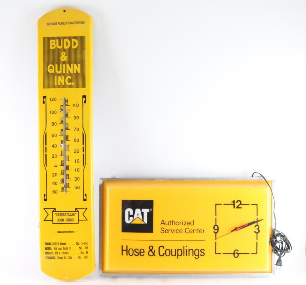 (1) Catapillar authorized service center clock and light. Light is in working order. Unable to test clock. (2) Budd & Quinn Inc "Catapillar" "John Deere" yellow enamel construction.