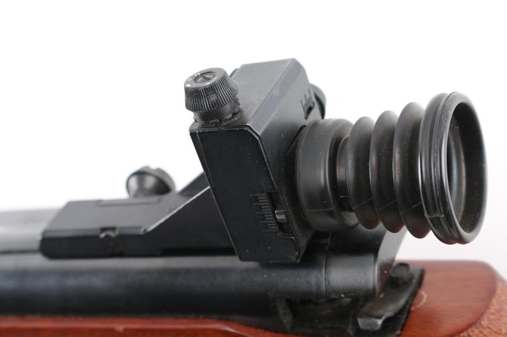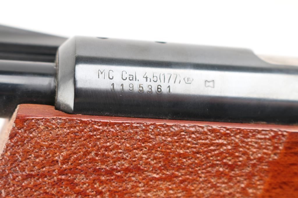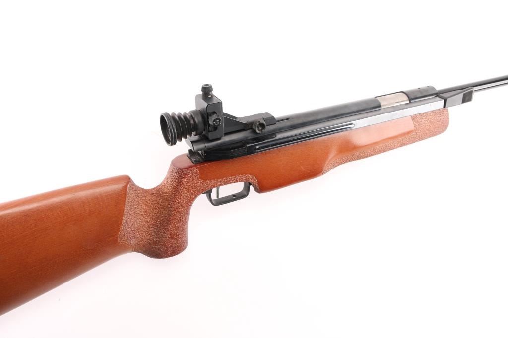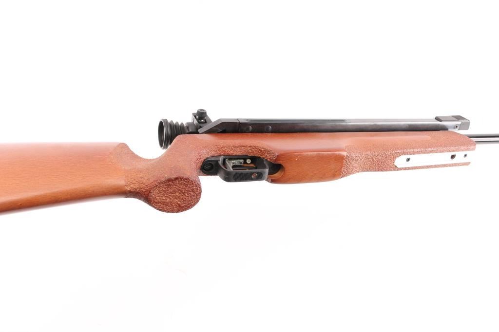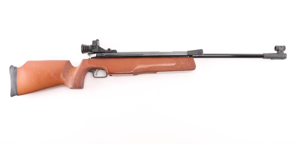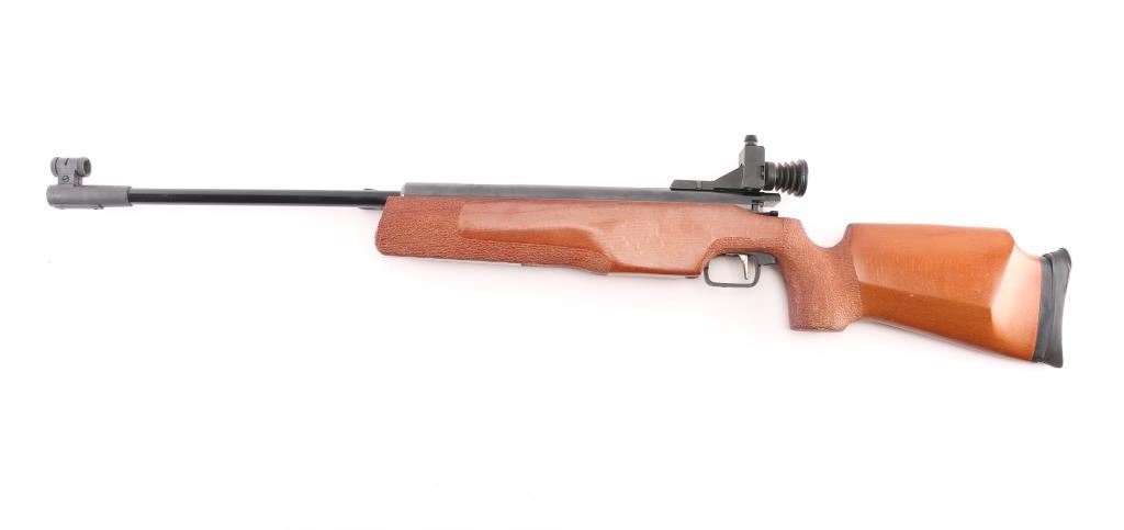 Spanish made single stroke pneumatic side lever cocking pellet rifle. Also sold as the Daisy 126 'Super Match'. Features blued finish, 17.5" barrel, hooded front & adjustable peep rear receiver sights, right-handed pistol grip beechwood target stock with “T” slot accessory rail on the underside of the forend, adjustable rubber butt pad. Bore is very good. Retains 90% finish with handling marks. Wood is very good with minor blemishes. Does not appear to pressurize, has a mechanical issue. Condition is Poor - Needs Repair