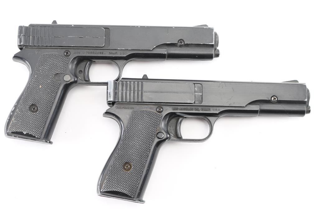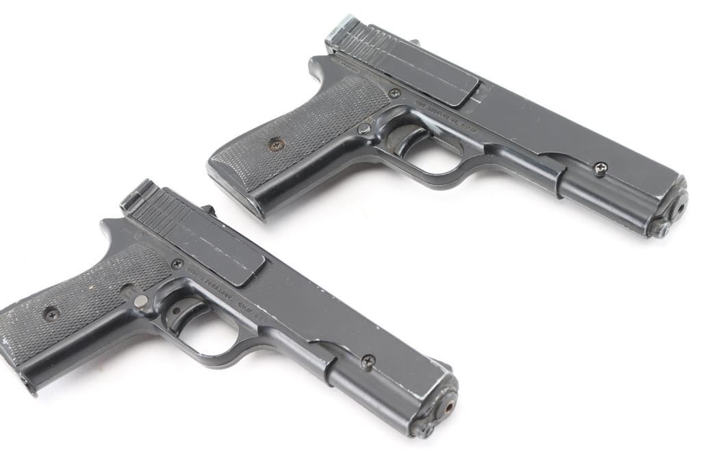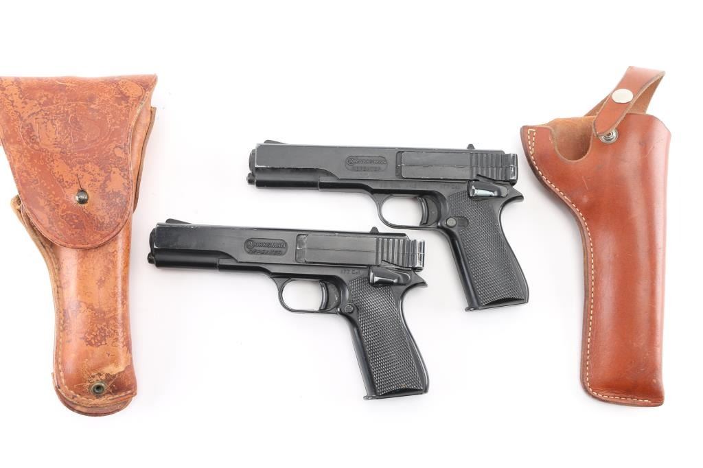 For BB's or single loaded pellets. One is good working condition, other is in Fair condition (does not automatically latch after cocking - can be manually latched to fire). Includes two holster, one a Boyt "45" marked tan leather WWII USGI 1911 holster in fair to good condition, other is a Bucheimer PM-13 belt holster in very good condition.