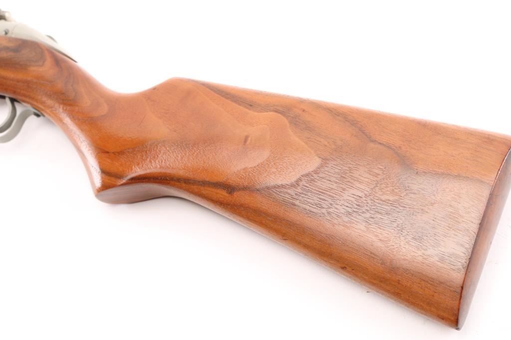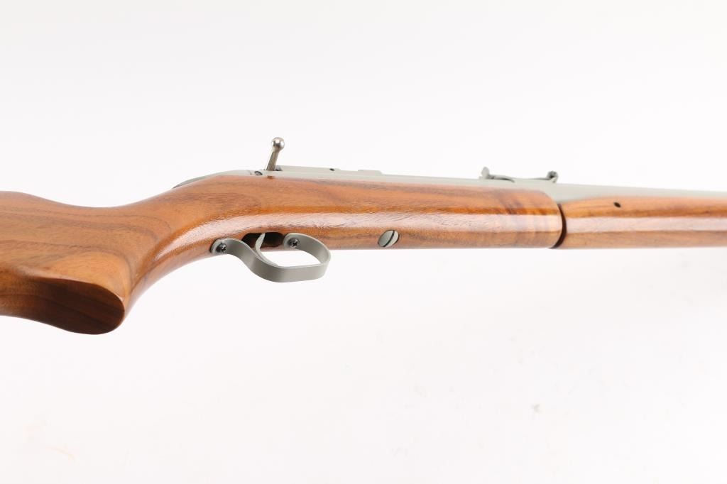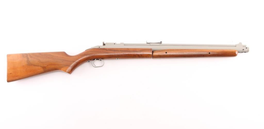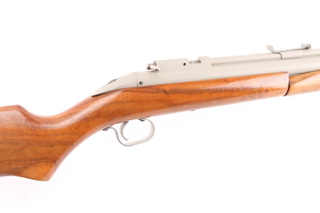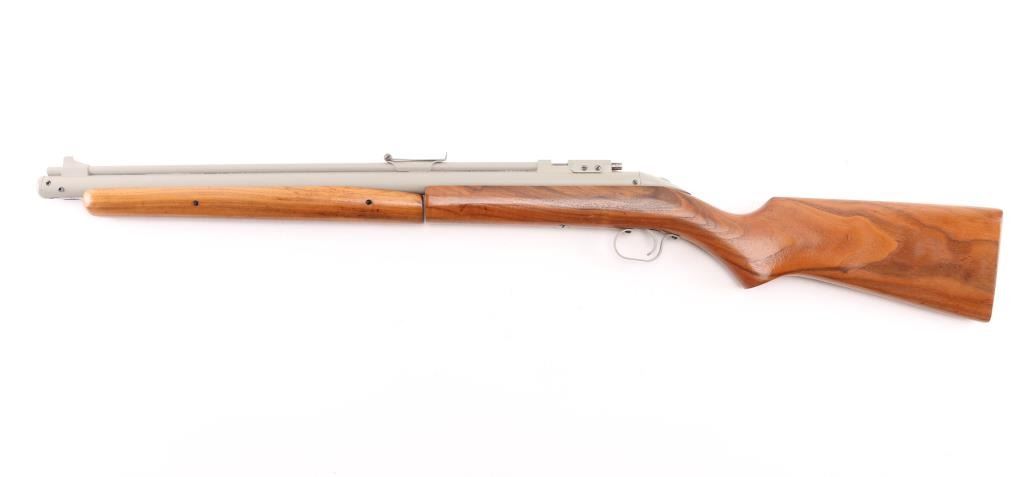 American made pump air rifle, with bolt action pellet loading and manual safety at tang (hold down to fire). Refinished with light gray paint or other finish. Blade front & adjustable rear sight, varnished smooth wood shoulder stock and pump handle. Rifled bore is very good. Condition is NRA Very Good as refinished