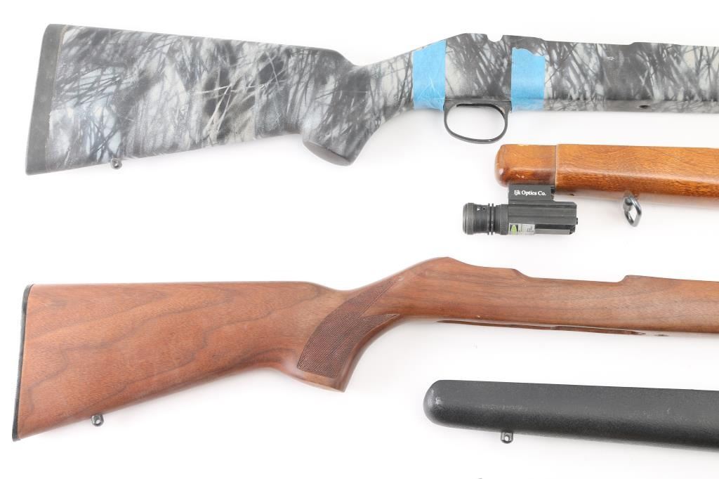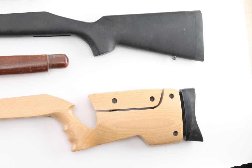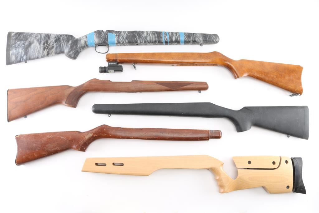 1) Ruger 10/22 factory take-off, very good overall, added sling swivels and laser module 2) Ruger 10/22 factory take-off, good overall, scratched and finish losses 3) Ruger 10/22 factory take-off, very good overall, checkered, sling studs 4) R.F.D. Rifles (Remington 700 or XP clone type single shot), gray camo, sling studs, bedded, with trigger guard, very good overall 5) Rem 700 by HS Precision, black color composite, bedded, very good condition 6) Unknown 22 Rifle stock, appears unused, like new, blond hard wood, adjustable comb & butt.