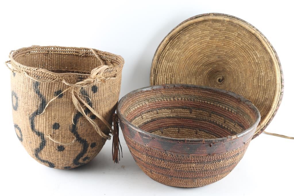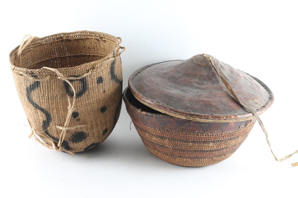One includes original lid, measuring 14 in diameter in good condition. (1.) Woven with hanger and black dotted pattern measuring 11 inches in diameter.