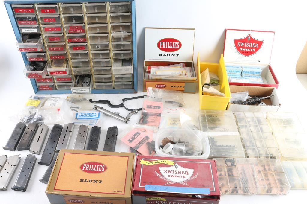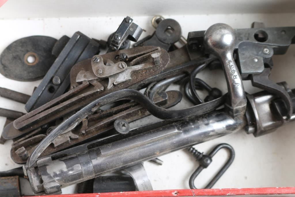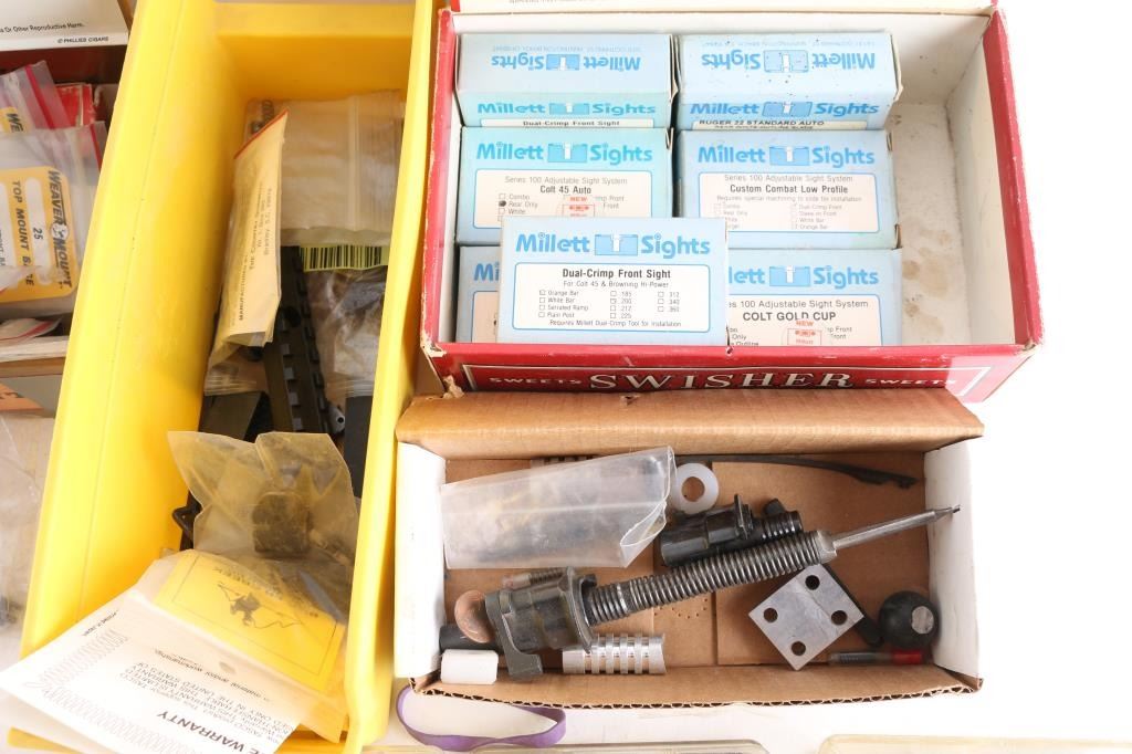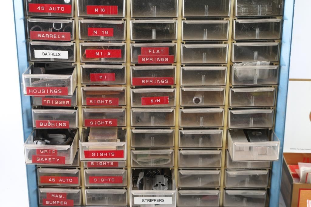 Includes metal drawer containing parts for 1911's, ie. barrels, triggers, safeties, magazines, M1A parts, sights. Mauser rifle & Springfield 1903 A3 parts, trigger guards, bolts, Millett sights, cases of assorted gun screws, compression springs, scope mounts & misc. other parts.