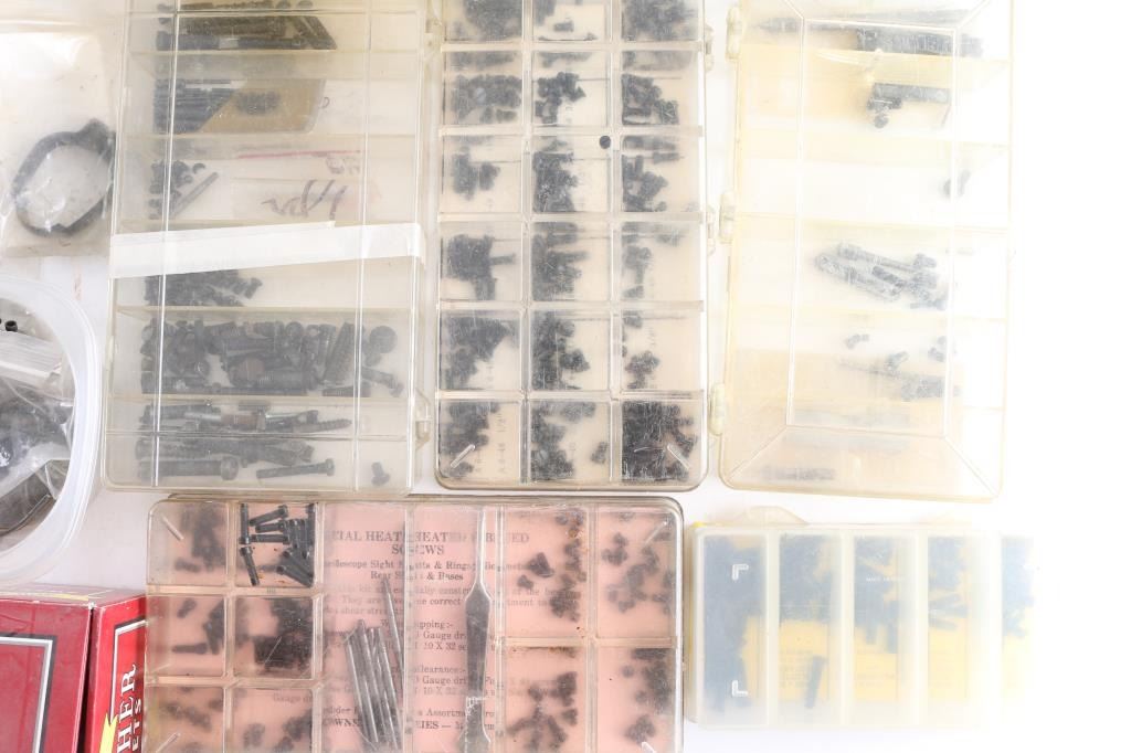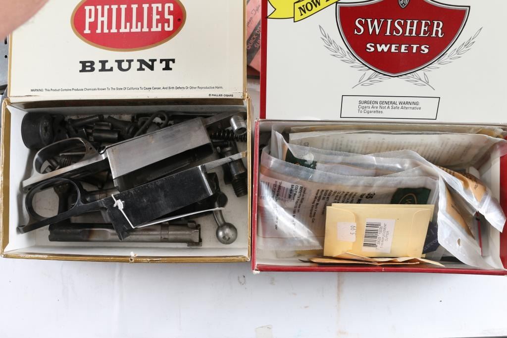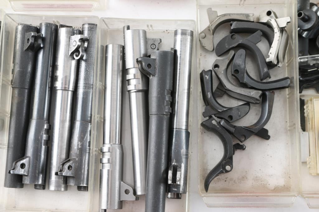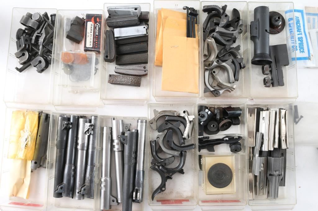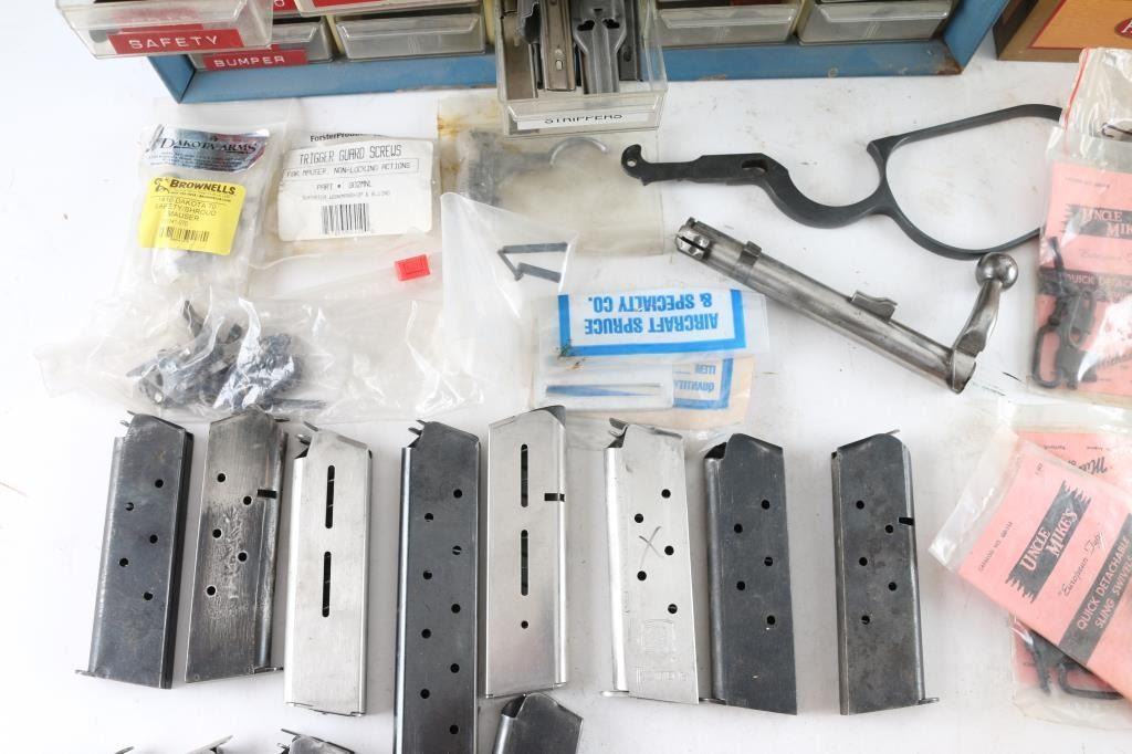Includes metal drawer containing parts for 1911's, ie. barrels, triggers, safeties, magazines, M1A parts, sights. Mauser rifle & Springfield 1903 A3 parts, trigger guards, bolts, Millett sights, cases of assorted gun screws, compression springs, scope mounts & misc. other parts.