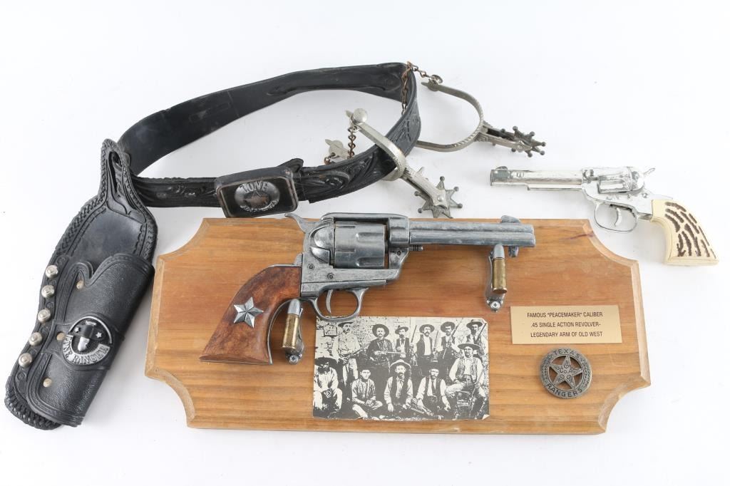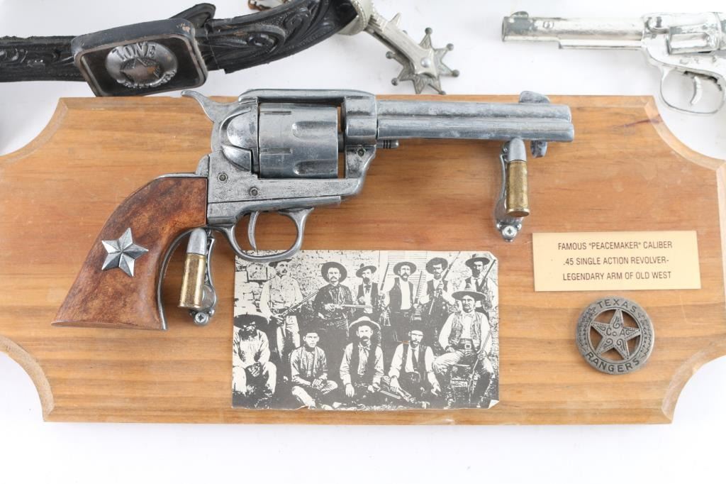(1)Lone ranger kids rig with cap gun and matching spurs (1)Famous Peacemaker Single action with wooden wall display