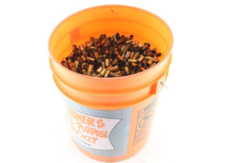 Approx. 51 Lbs of spent 45 ACP brass, in plastic bucket.