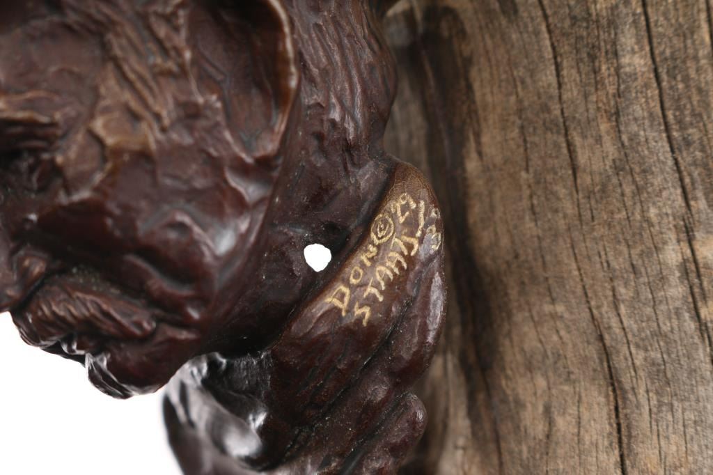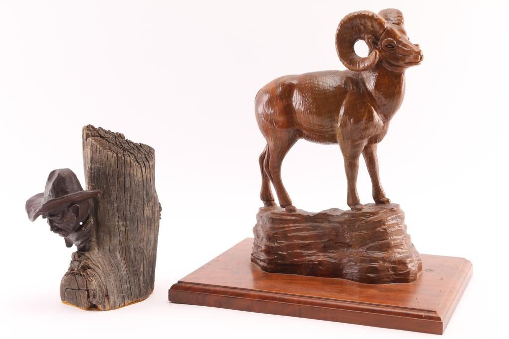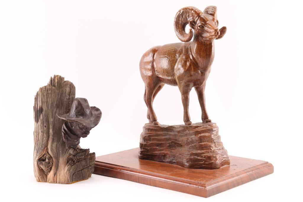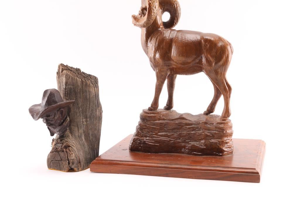(1) Original fine art bronze by noted Arizona artist Don Staats of Cornville AZ. Depicting a cowboy mounted on wood, #29/30. Measures 6"x3.5"x7.5" overall. & (1) Ironwood ram carving mounted on base. Measures 8 3/4"x11 1/4"x12".