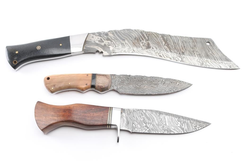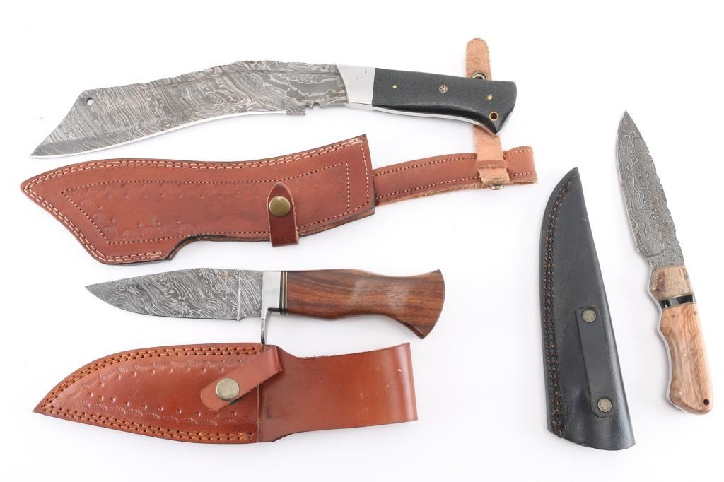 Lot 1736 3 Fixed Blade Damascus Knives w/ Sheaths