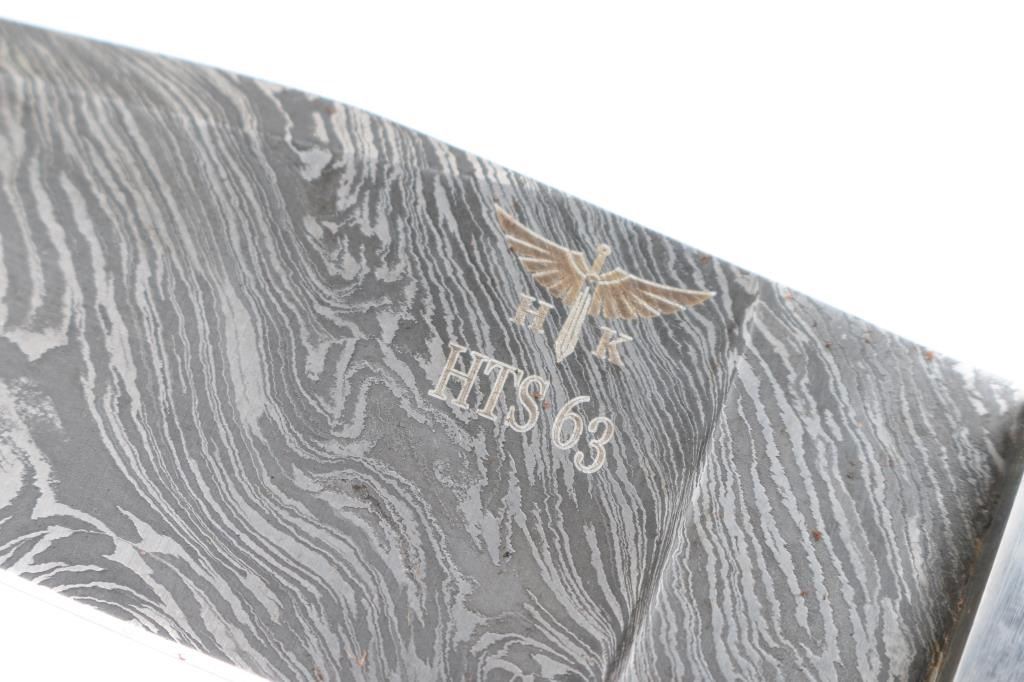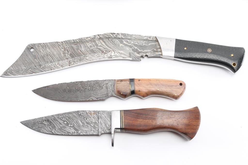 (1) Unmarked, Kukri styled. Measures 15" overall with 8" sharpened edge. Black handle of unknown material. (1) Marked "HK" & "HTS 63" on blade. Large curved wood handle. Measures 10.5" overall with 5" sharpened edge. & (1) Marked with an intertwined "SF" on the blade. Measures 9" overall with a 4.5" sharpened edge. Stained wood handle.