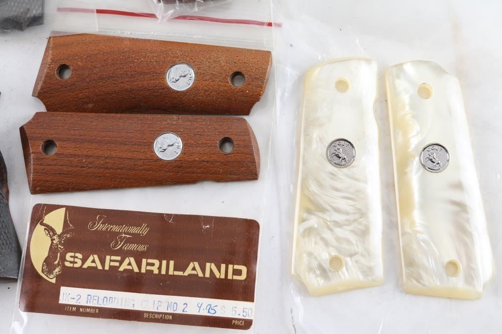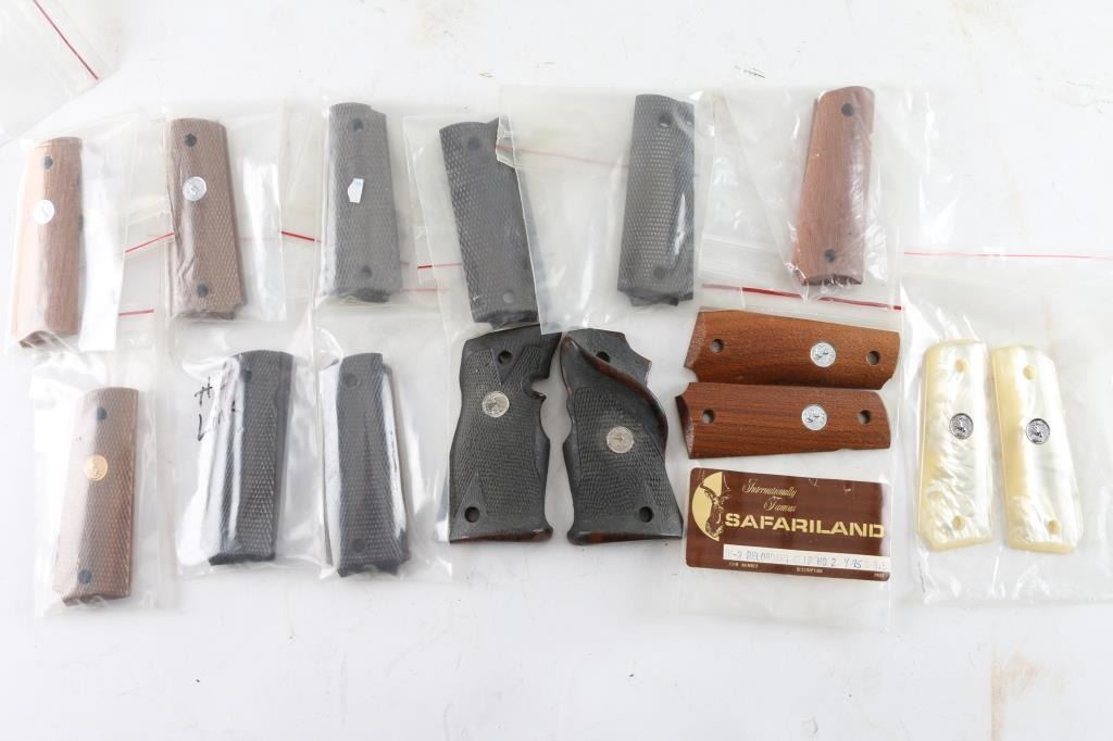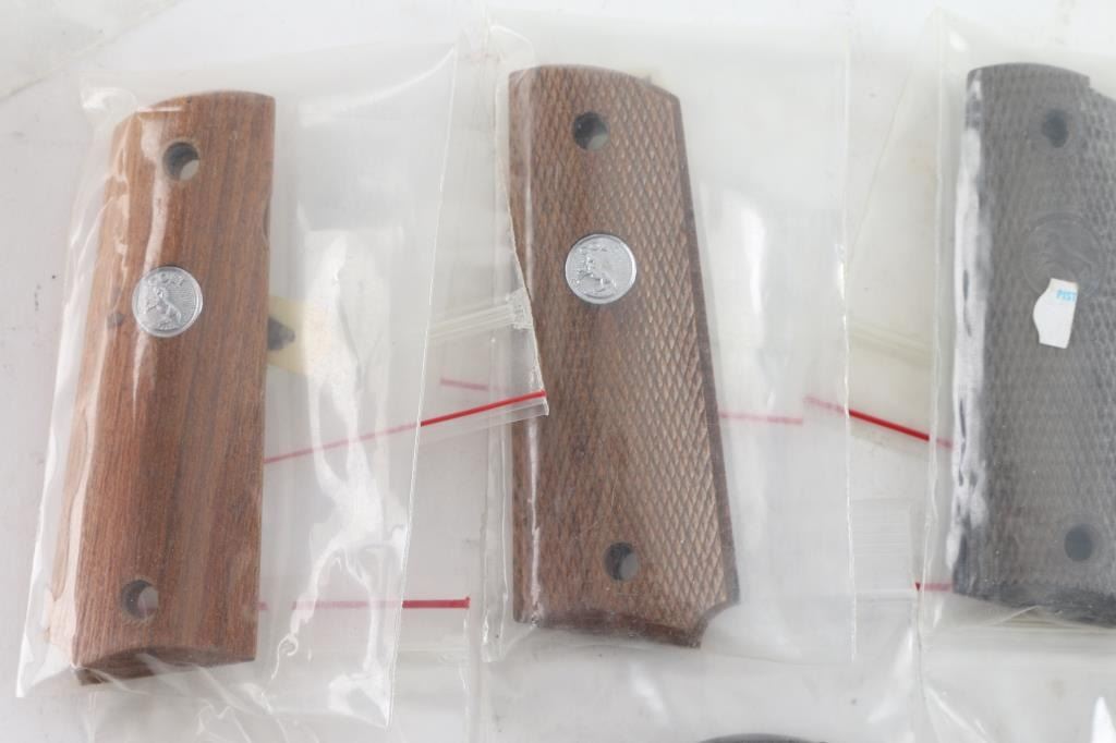 12 Pairs total. 5 - Medallion Wood Grips, 1 - simulated pearl w/medallion, 1 - plain wood & 5 - plastic, for 1911.