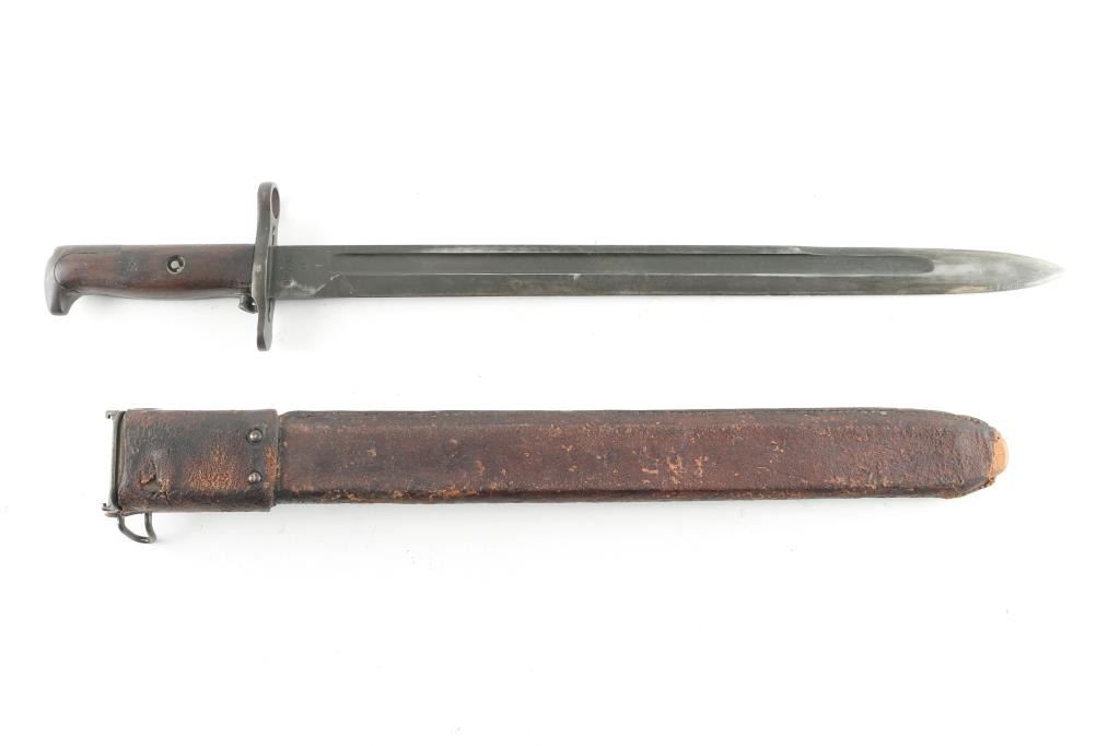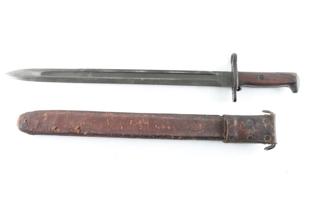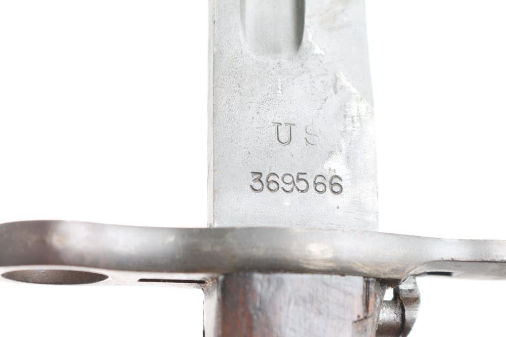 with 16" blued steel blade, 20" overall. Fits 1903 and 03A3 Springfield rifles, as well as M1 rifle. Marked "RIA (flaming bomb) 1918" on one side, other marked "US 369566". Blade is very good condition with good+ condition smooth walnut scales. Leather covers wood scabbard is fair to good condition, with losses to leather, some stitches missing.