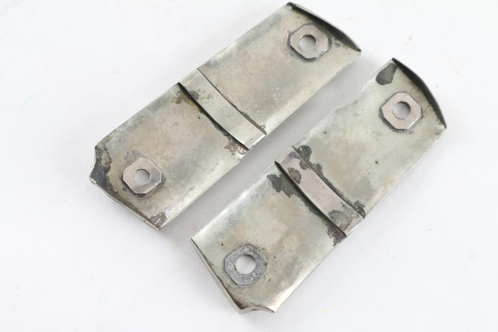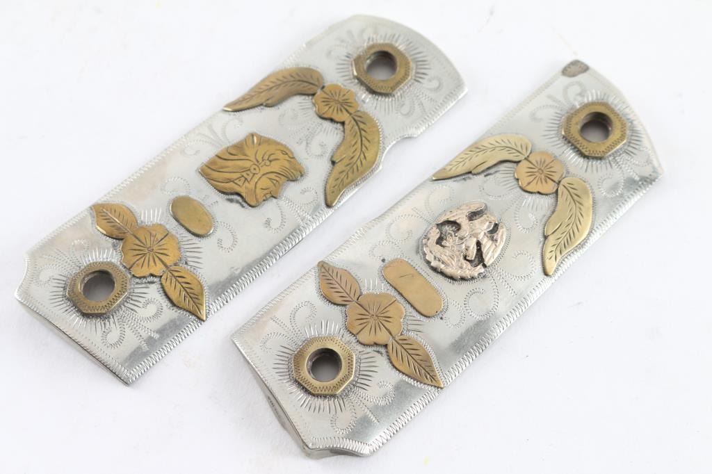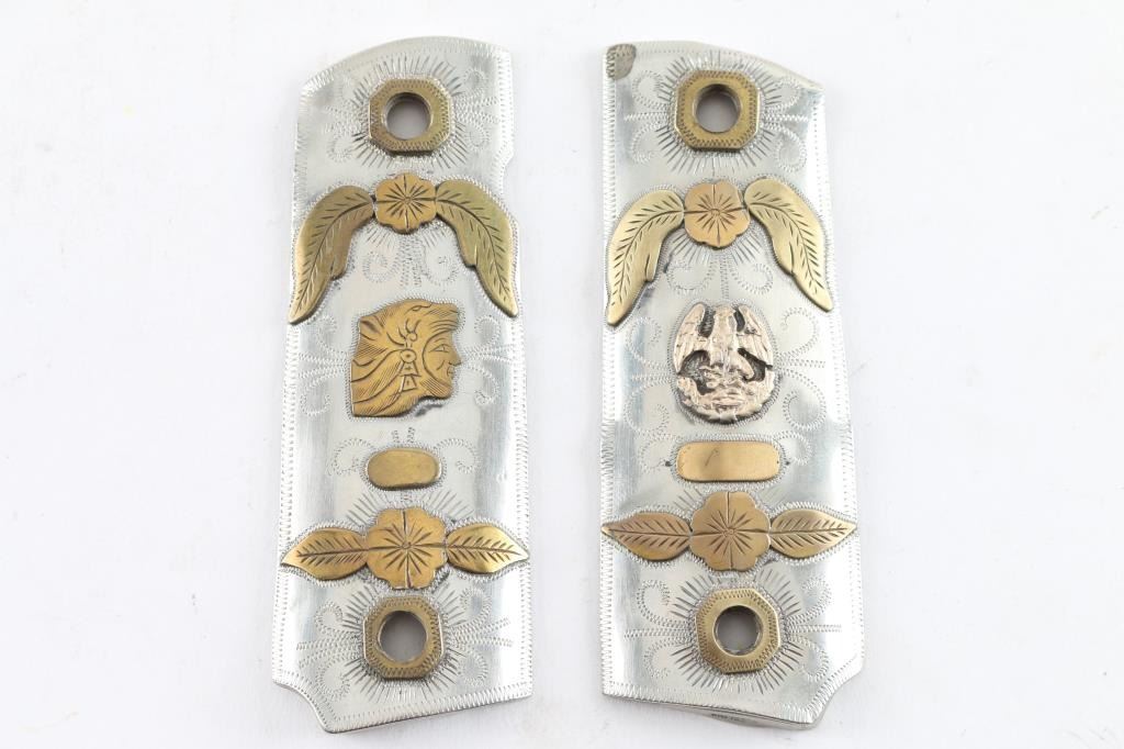 1 pair of silver plated 1911 grips. One side has eagle w/snake and other side has Mayan figurehead.