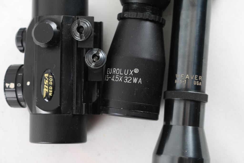 Includes 2 - Weaver scopes, V9-B 3-9X38 w/mount and rings & K1.5-1; 1 - Tasco AO-59 3X9 w/QD mount and rings; 1 - Eurolux 4.5X32; 1 - BSA red dot. All clear and in good condition.