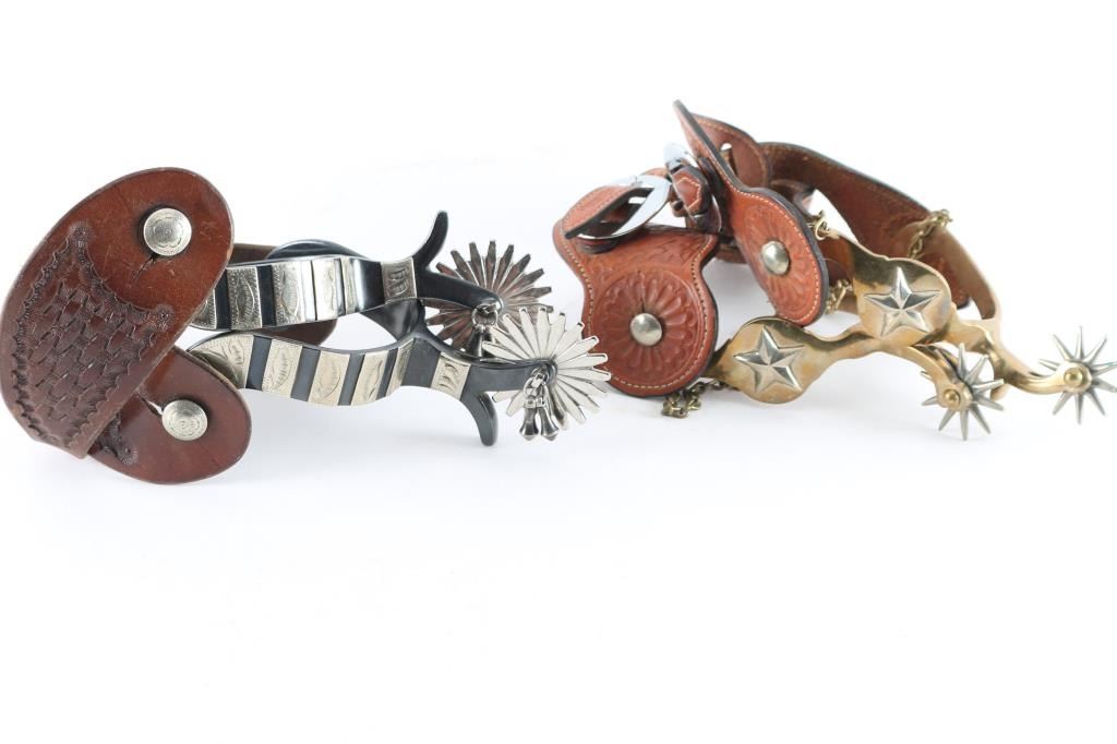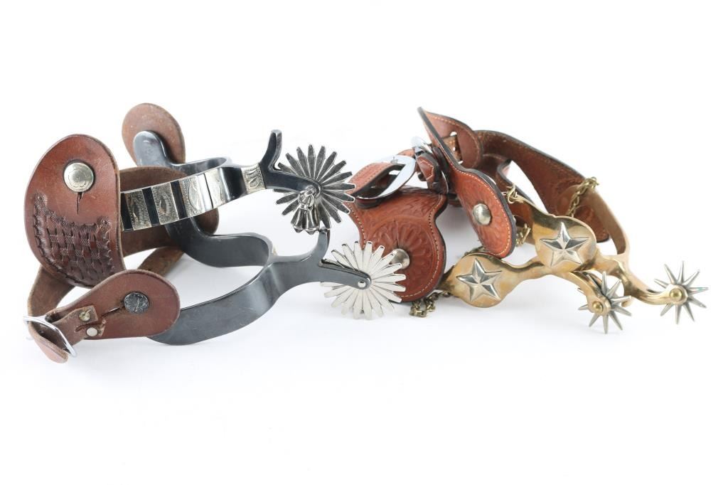 (1) Pair of Brass Texas Star spurs with leather straps (1) Pair of Black metal spurs with striped silver overlaid design with leather straps