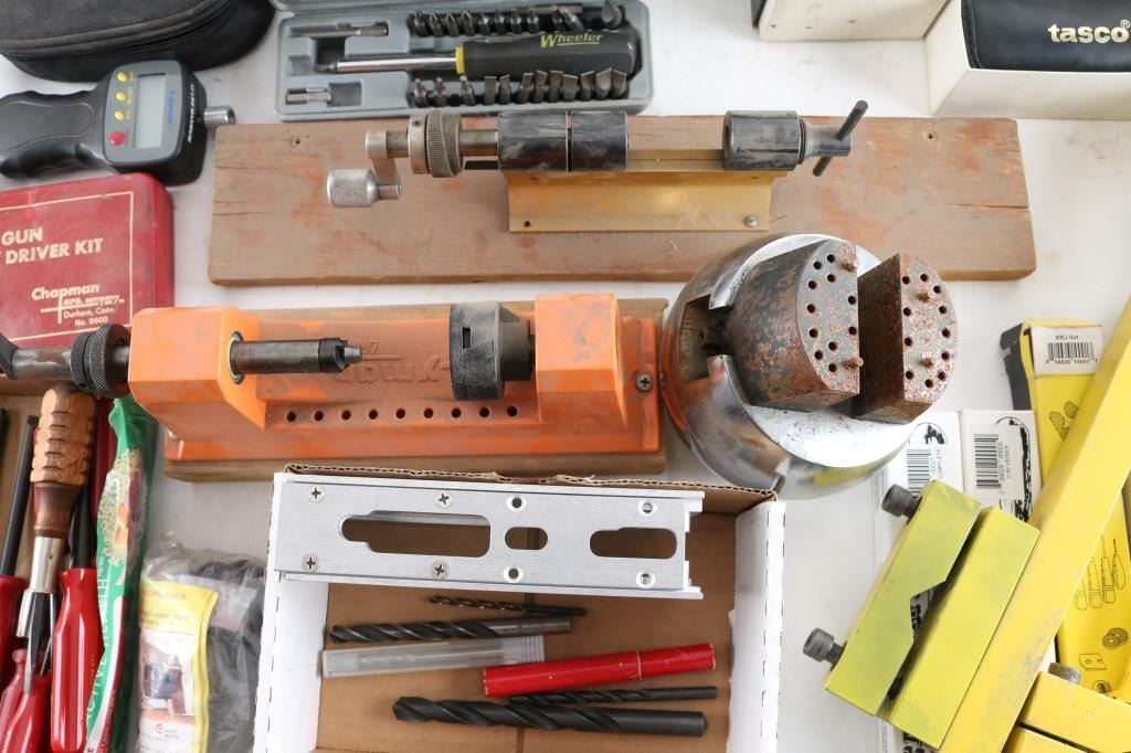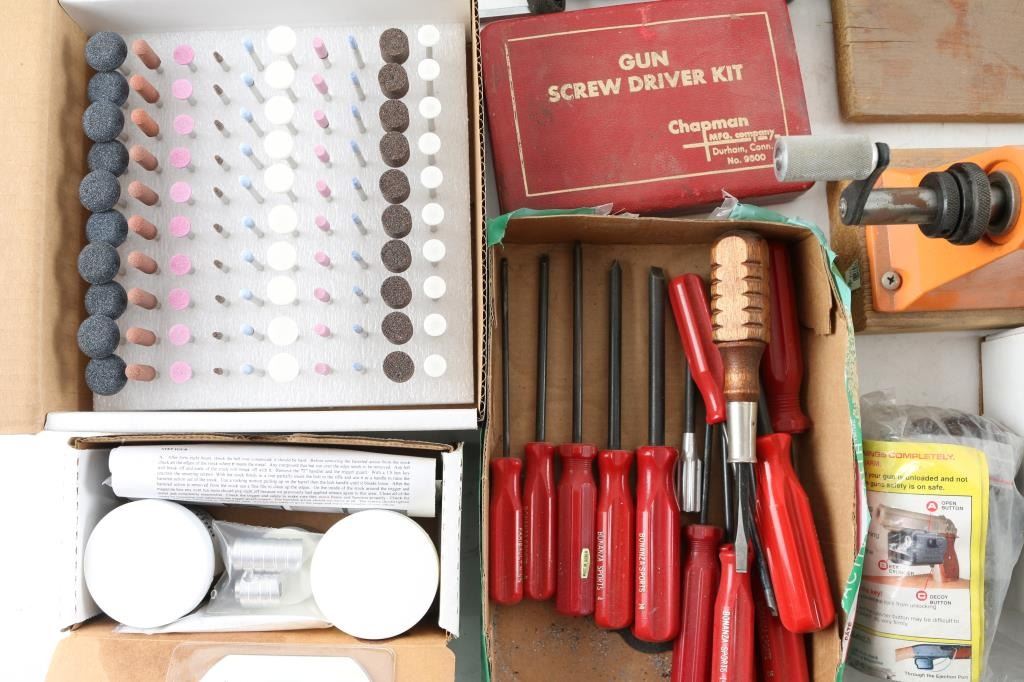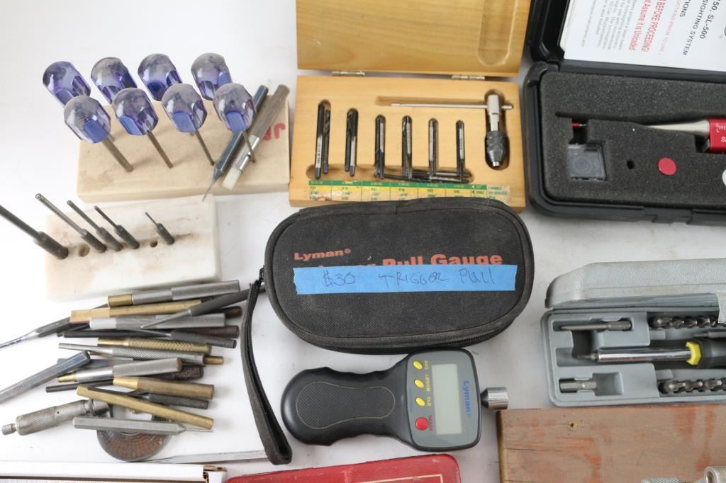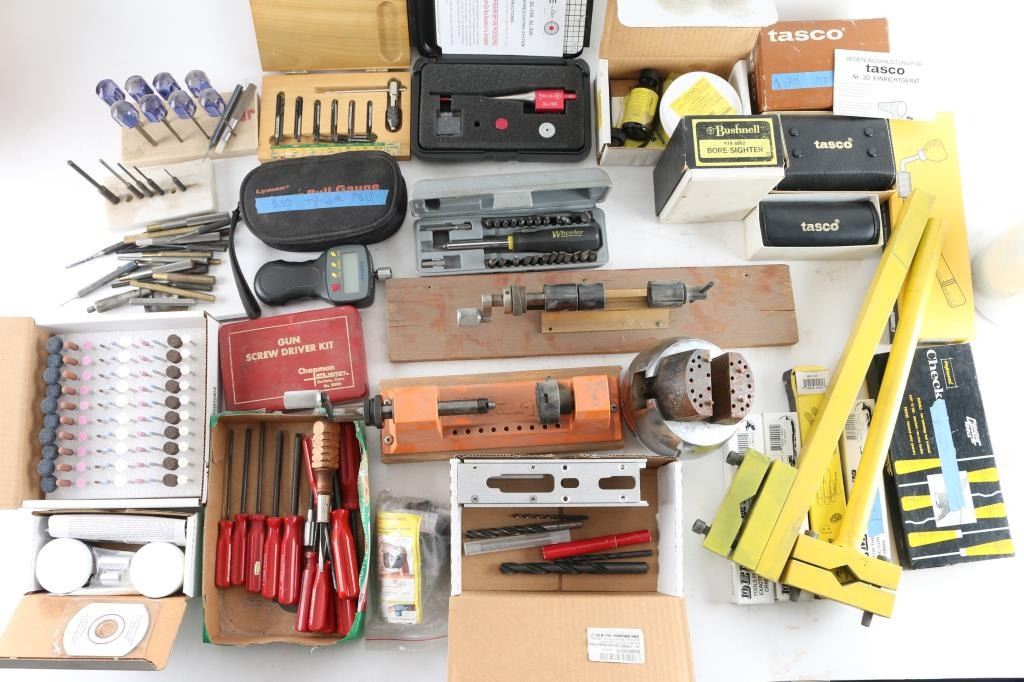 Includes heavy duty action/barrel wrench, heavy ball vise, AR15 80% milling guide, deluxe bedding kit, 2 case reamers, 3 bore sighters, tool sets and other misc. tools.