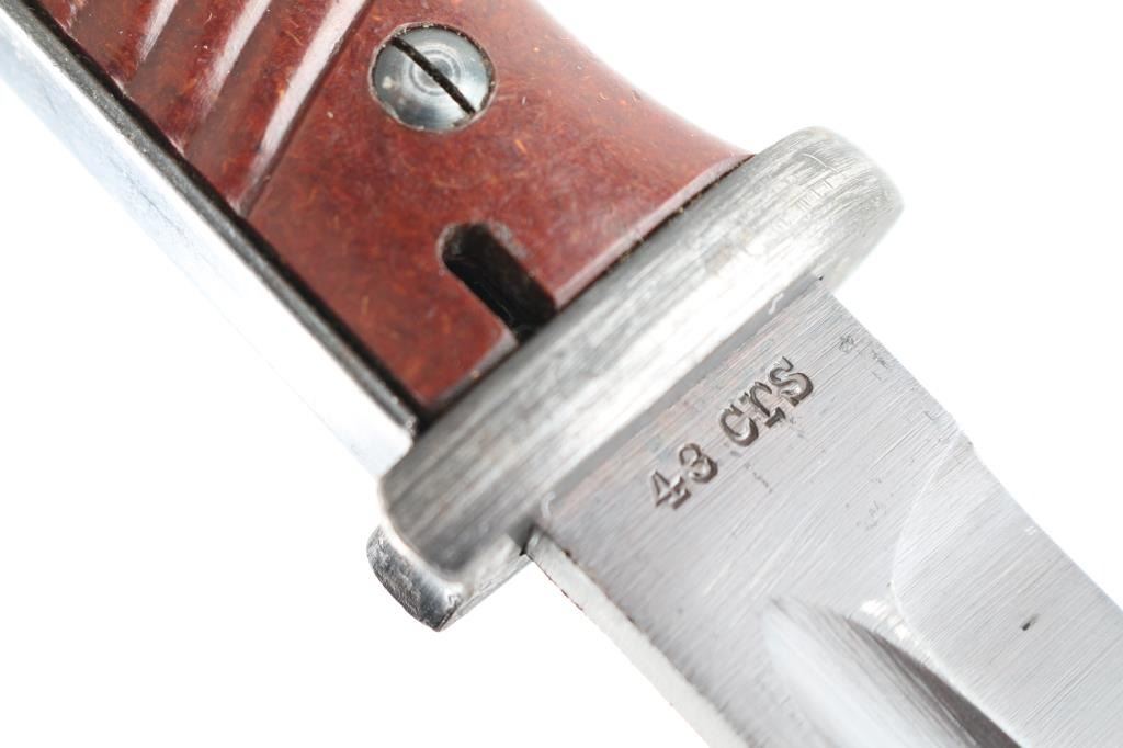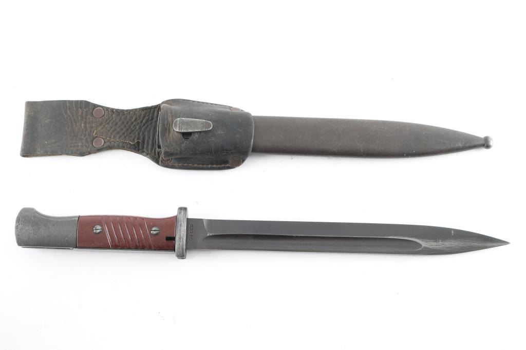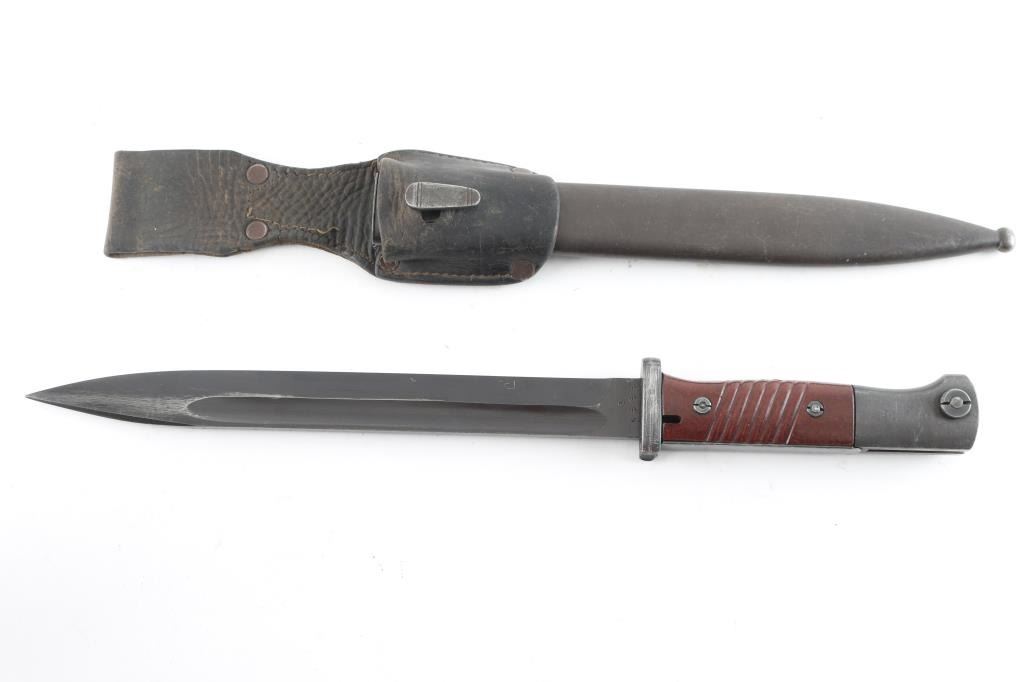 "43 crs" marked blade, 15" overall. Has brown bakelite scales, Waffenamt on pommel. Blued steel scabbard is unmarked, with leather frog. Overall very good or better condition, with the good condition leather showing some age.
