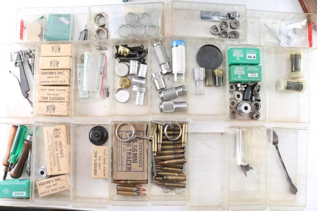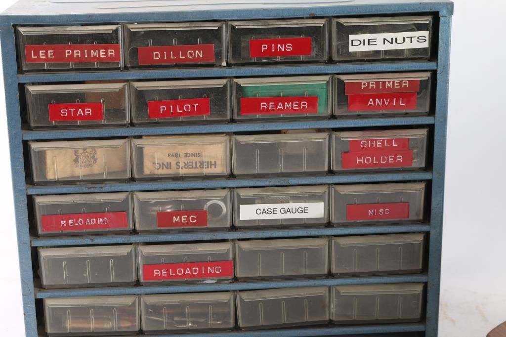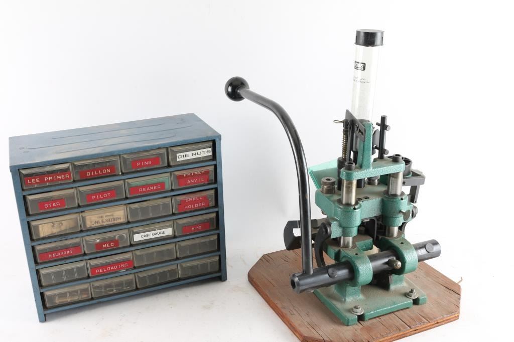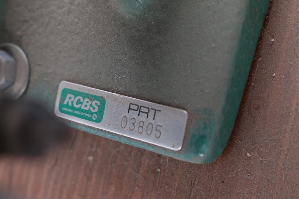 includes a RCBS PRT "Green Machine", linear reloading press and small metal drawer of accessories & parts. 38-357 dies installed. Good condition.