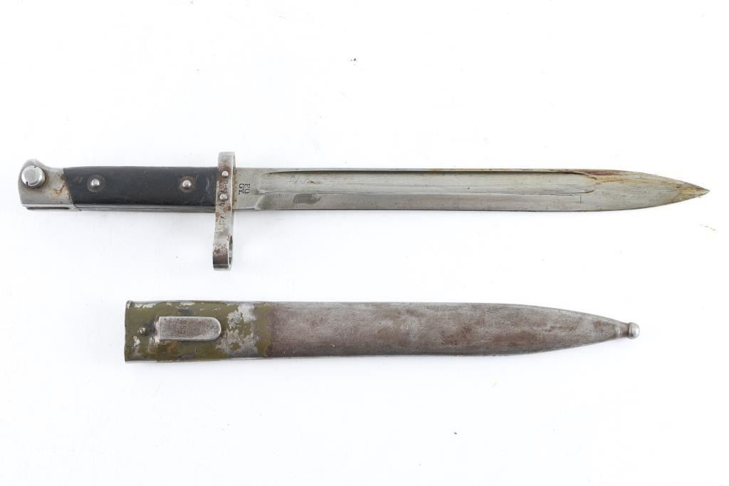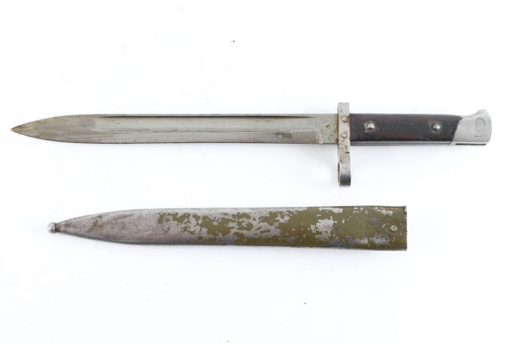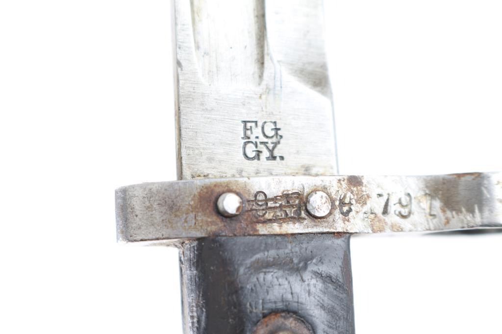 Mannlicher rifle M 1895 Cal. 8 x 50R.9 1/2" fullered blade with Hungarian makers logo F.G.G.Y(=Femaru Fegyver Gepgyar in Budapest) on ricasso. Hungarian crest on reverse side. Excellent wooden grips riveted to the blade tang. Steel scabbard.