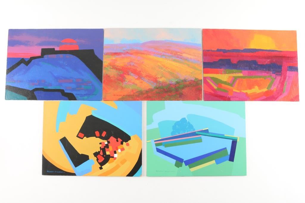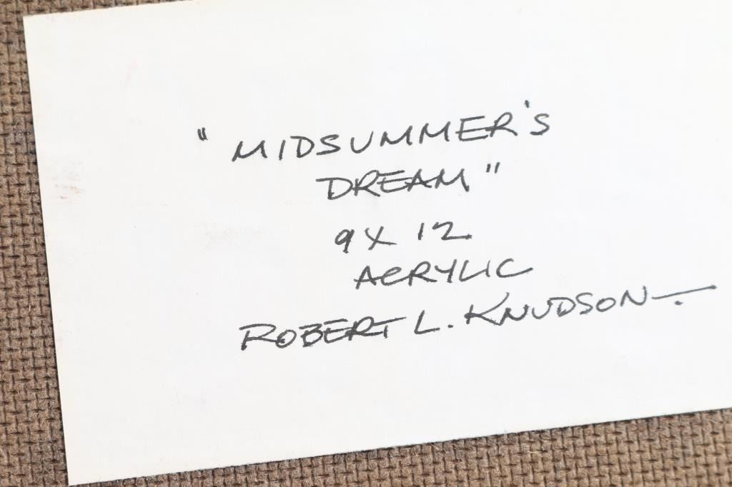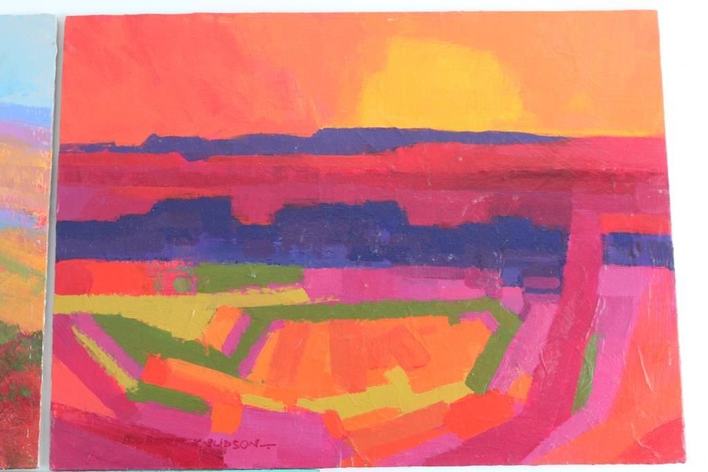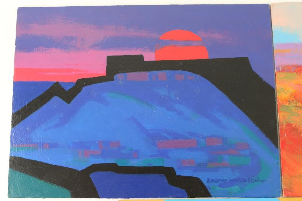 by Prescott Valley artist, Robert Knudson measuring 9x12, all signed, titles are: (1) Hopi Fields (2) Autumn Hills (3) Altar of the Dawn (4) Midsummer's Dream and (5) Continental Shift The work of Bob Knudson is represented in major collections through out the US including the William Penn Memorial Museum amd the Museum of Northern AZ. His painting frequently appear in Arizona Highways and he has been member of the Mountain Oyster Club the oldest and most prestigious cattleman's club in the Southwest.