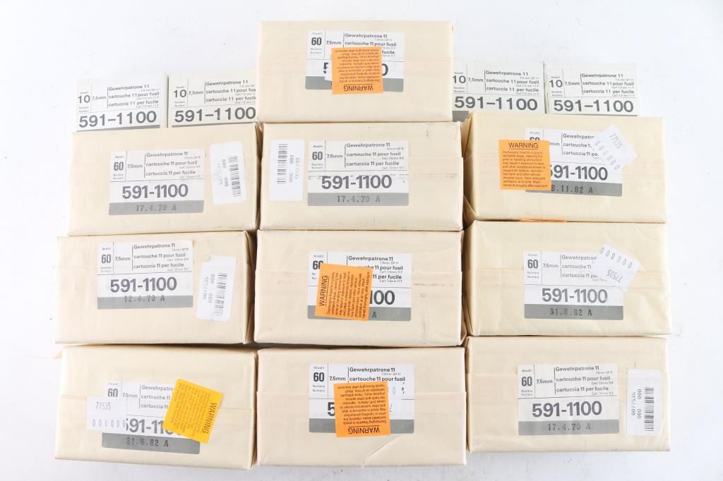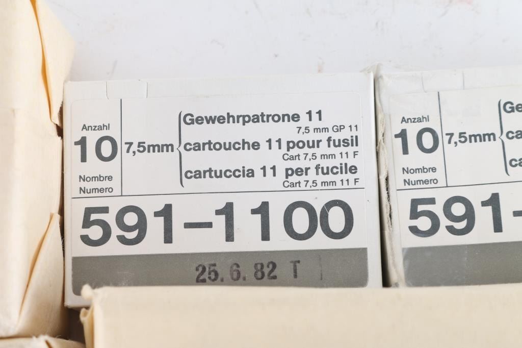 Approx. 650 rounds of factory new Gewehrpatrone 11, 7.5 X 55mm, in factory boxes, wrapped in arsenal paper packaging.