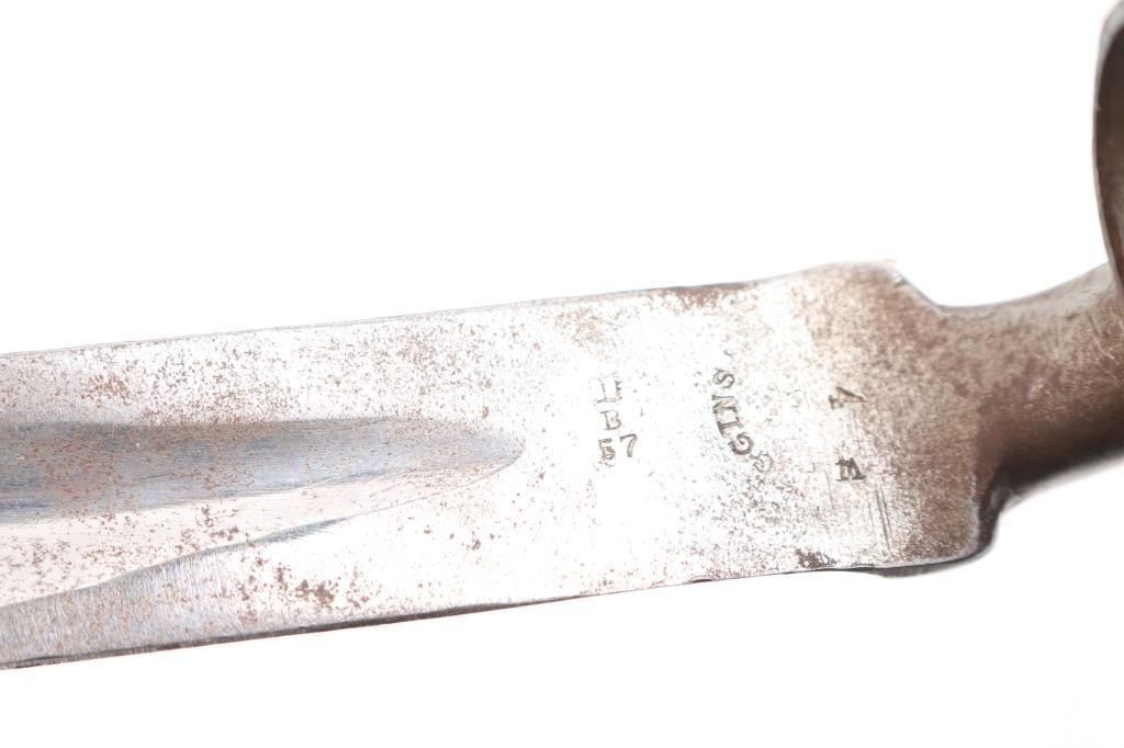 P-1853 Enfield Rifle Socket Bayonet. Locking ring intact, rack number "98906" stamped on socket. "D B 57", and maker "GINS" stamped on ricasso. Overall very good condition.