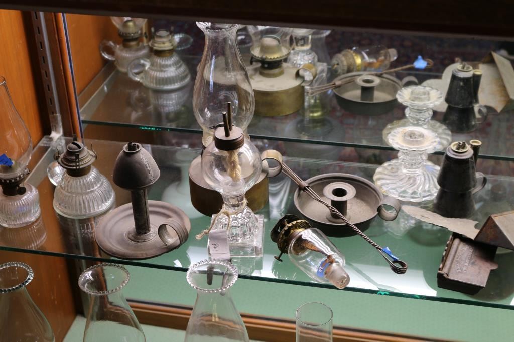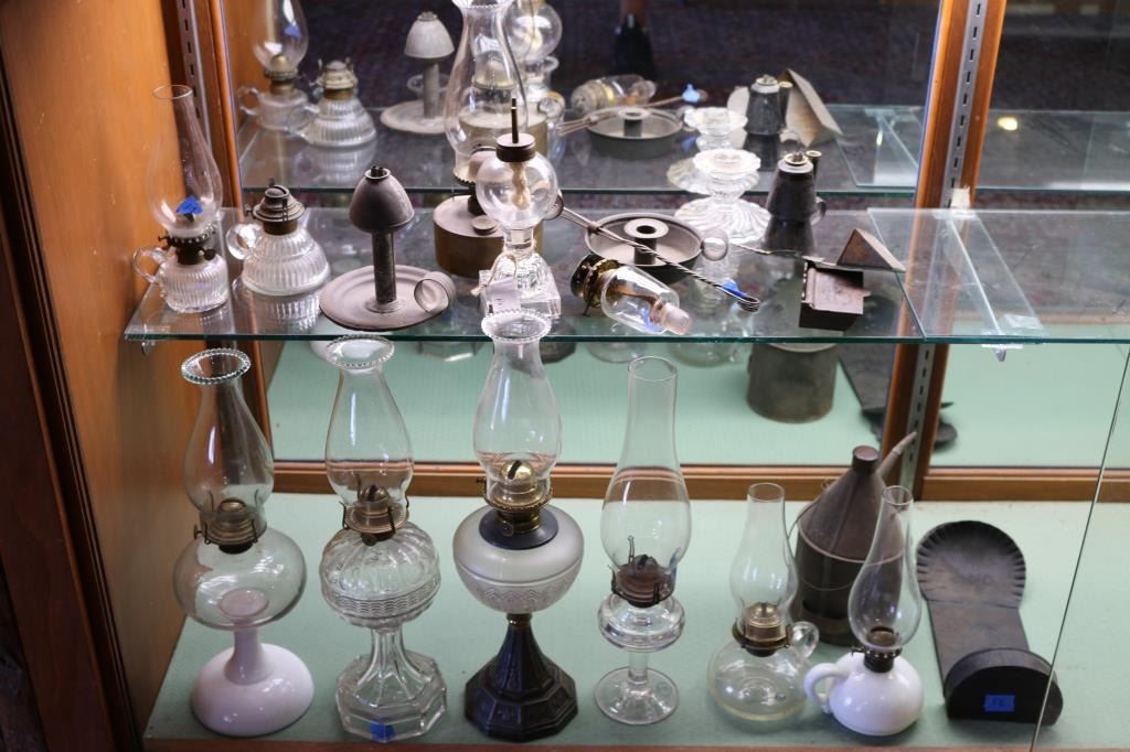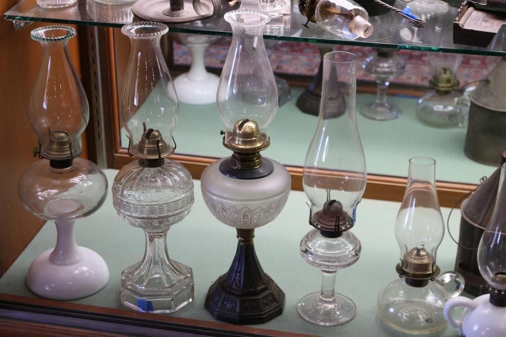 including several Kerosene and Whale Oil Lamps on delicate and milk glass bases, a couple wall mounted tins for matches, candlestick holders, kerosene jug, a mason jar mug, brass lamp and more. Great condition overall considering age.