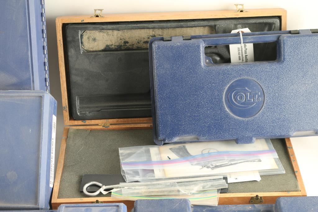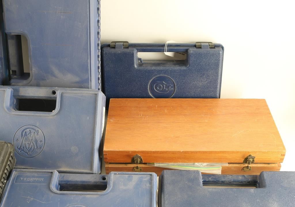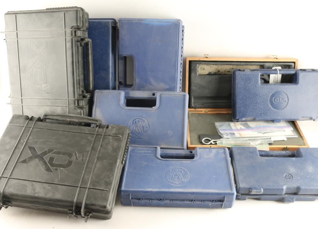 includes: (2) - black plastic hard cases for Springfield Armory XDM, one w/ 3 - 19 rd magazines, back straps, holster & speed loaders. (1) wood hard case for S & W revolver up to 8" barrel w/ cleaning kit. (6) blue plastic hard cases for S & W pistols, various sizes & (2) blue plastic hard cases for Colt pistols. .