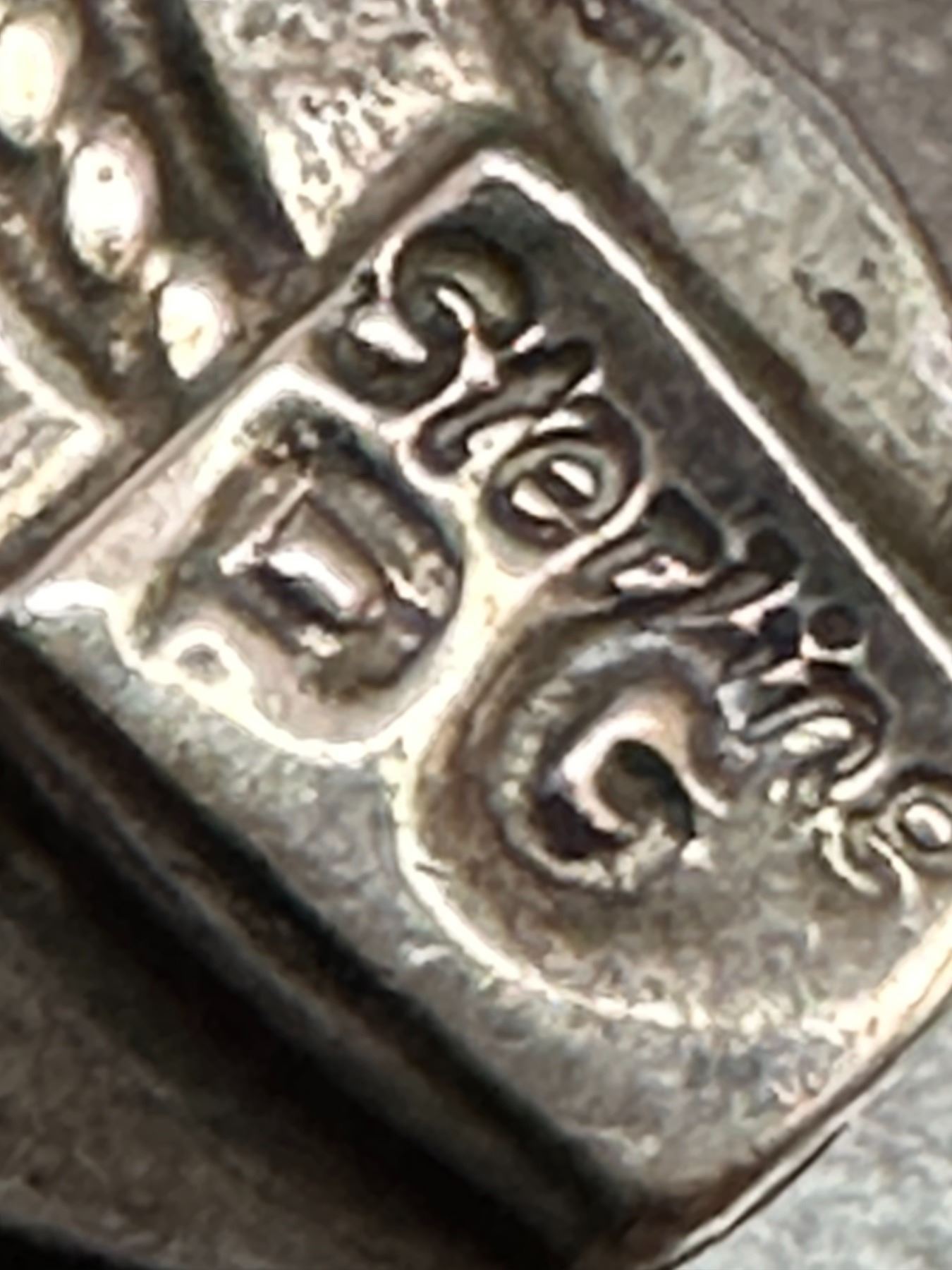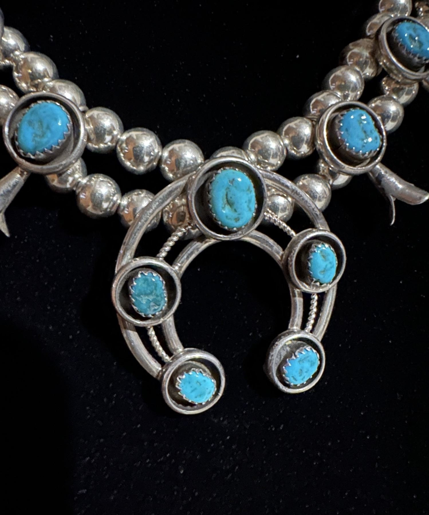 This magnificent circa 1970s Navajo Squash Blossom Necklace showcases a double strand design of silver pearls with four Sleeping Beauty turquoise nuggets on each side and five turquoise nuggets on the Naja. Each is a perfect match with a striking deep blue color and distinct black web from the Sleeping Beauty Arizona mine. The workmanship on the silver scrolling is unique to this necklace, with a hallmark of master silversmith Phil Garcia, a well-known Navajo silversmith. As with many native cultures, wealth was often worn in the form of adornment and in many early photographs of the Navajo and other Southwestern Native peoples, Squash Blossom necklaces were worn with pride and reverence for their beauty and inherent value. Weighs 2.1 oz and measures 11.5" in length when closed and 20" overall. DSC FOUNDATION THANKS DSC NEW MEXICO CHAPTER FOR THIS 100% DONATION.