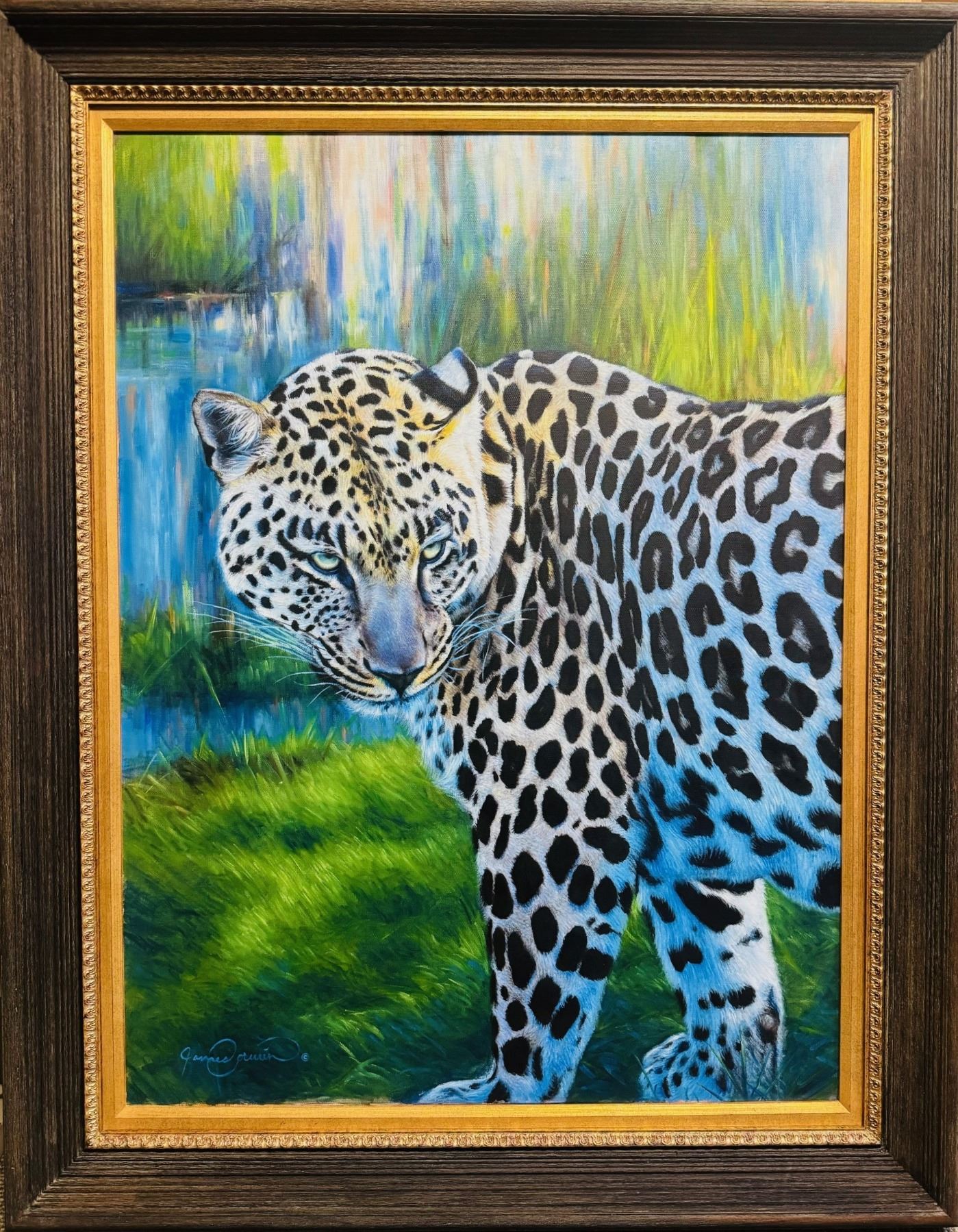 "Blended" - Original oil painting on canvas by wildlife artist James Corwin, measures 38"x48" in a beautiful custom frame. This stunning piece depicts an African leopard wandering through the marsh while the sun sets, saturating the earth in warm light. The cool surface of the water reflects on the underside of the leopard creating a stunning visual effect of color. This contemporary painting blends both realism and loose gestural brush strokes in the background. DSC FOUNDATION THANKS JC & BRANDY LEWIS FOR THIS 100% DONATION.