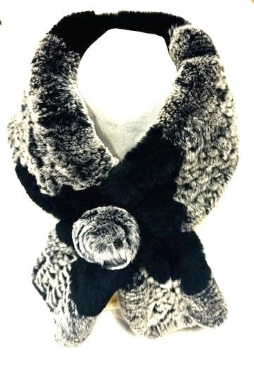 This lovely grey/black knitted Rex rabbit fur scarf with rosette closure will add touch of warmth and style to any weather wardrobe - spring, summer, fall and winter. Luxuriously soft and lightweight. Measures 33". DSC FOUNDATION THANKS CASCADE FUR SALON FOR THIS 100% DONATION.