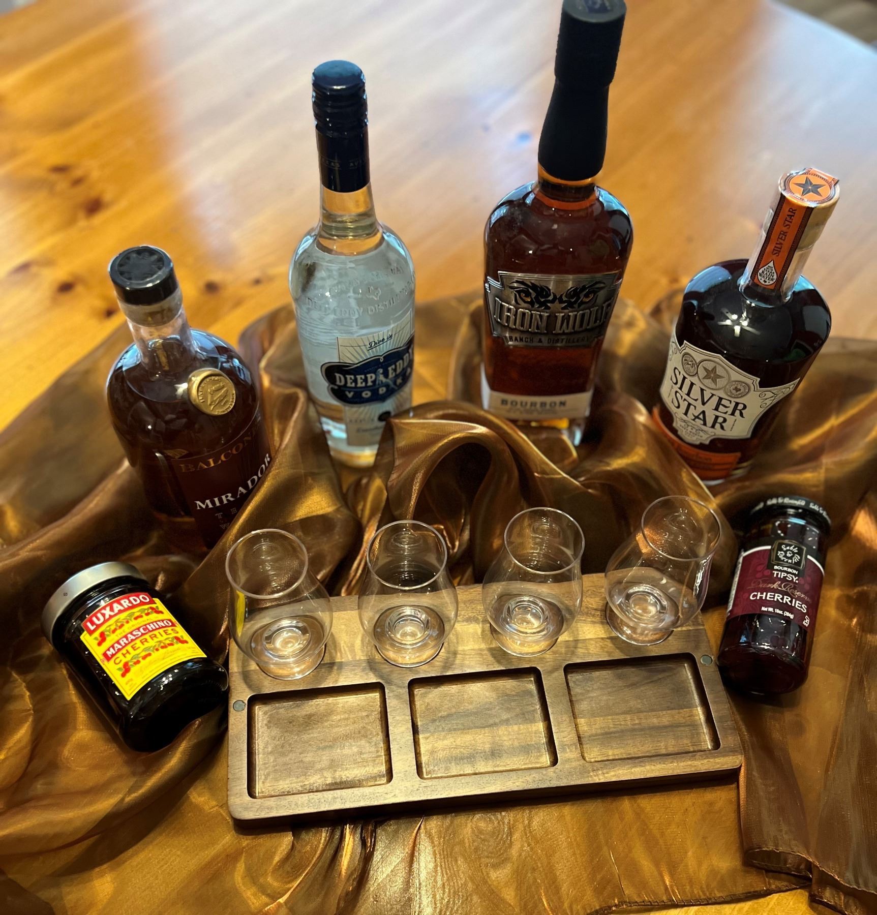 IN ROOM ONLY BIDDING: Wet your wistle Texas-style with this locally sourced tasting tray of spirits. Package includes four bottles of Texas-made whiskey/vodka, an assortment of paired bourbon cherries, four tasting glasses and matching serving tray. DSC FOUNDATION THANKS TORI & ABE NAYFA FOR THIS 100% DONATION.