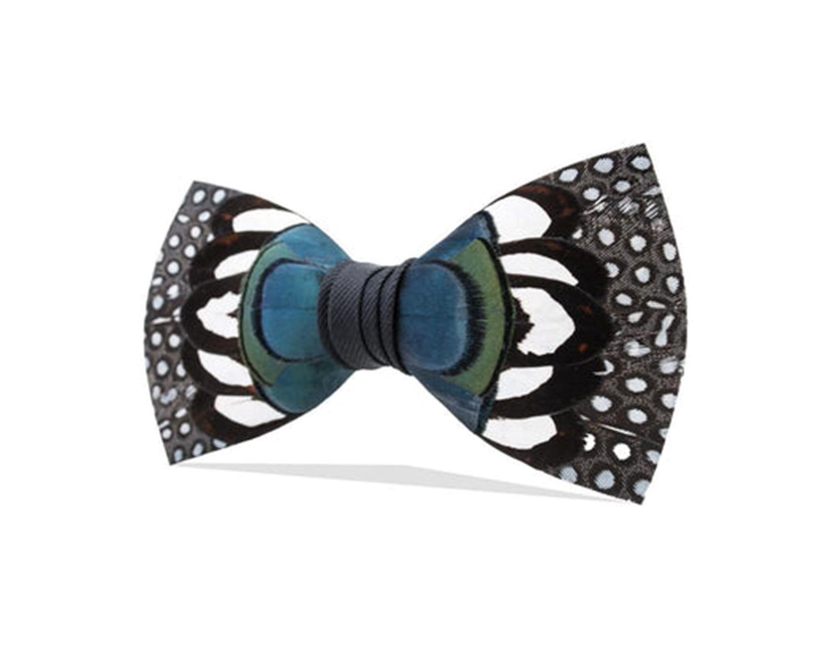 Edisto is a black and blue bow tie crafted with navy, forest green, black, and white pheasant feathers, and grey and white dotted guinea feathers. Center wrap is black grosgrain. DALLAS SAFARI CLUB THANKS BRACKISH FOR THIS 100% DONATION.