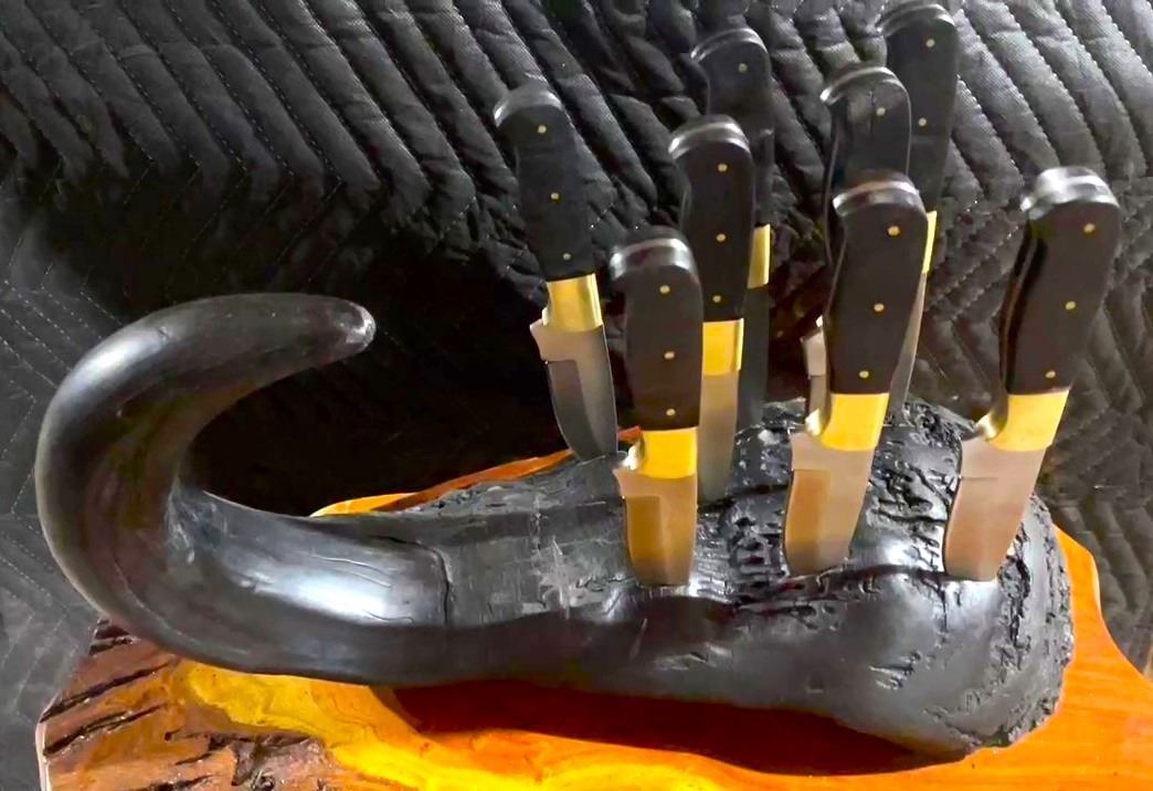 This conversation starter is a functional work-of-art that will make the perfect centerpiece display at your next wild game dinner party. Set includes eight (8) knives with Cape buffalo horn handles and a Cape buffalo horn display base. DSC FOUNDATION THANKS RUSSELL & MARY EDITH STACY FOR THIS 100% DONATION.