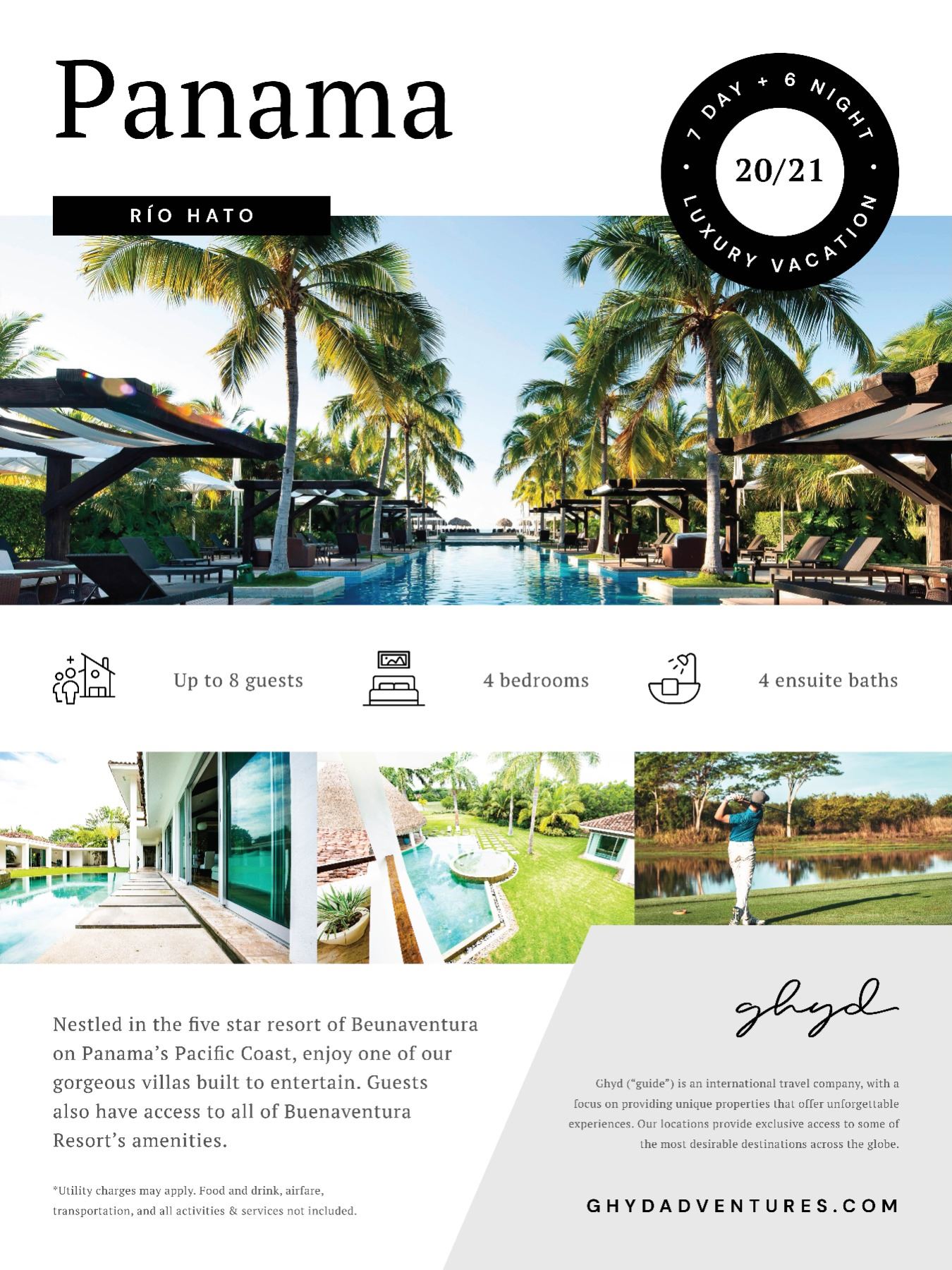 Enjoy 7 days / 6 nights in Panama’s Buenaventura Resort on the Pacific Coast. Our property offers the space and privacy in a style that fully embodies our luxury standard. The villa has a private pool, as well as access to all of the resort’s amenities. Enjoy a pristine outdoor living space and beautiful, white sand beaches a stone’s throw away. We offer 24/7 on-site full-service concierge, a trip planning specialist, custom itinerary, and special offers and unique experiences only offered to Ghyd guests. Trip expires 18 months from date of purchase. Includes villa stay only. All transportation, meals, activities, etc. are not included.