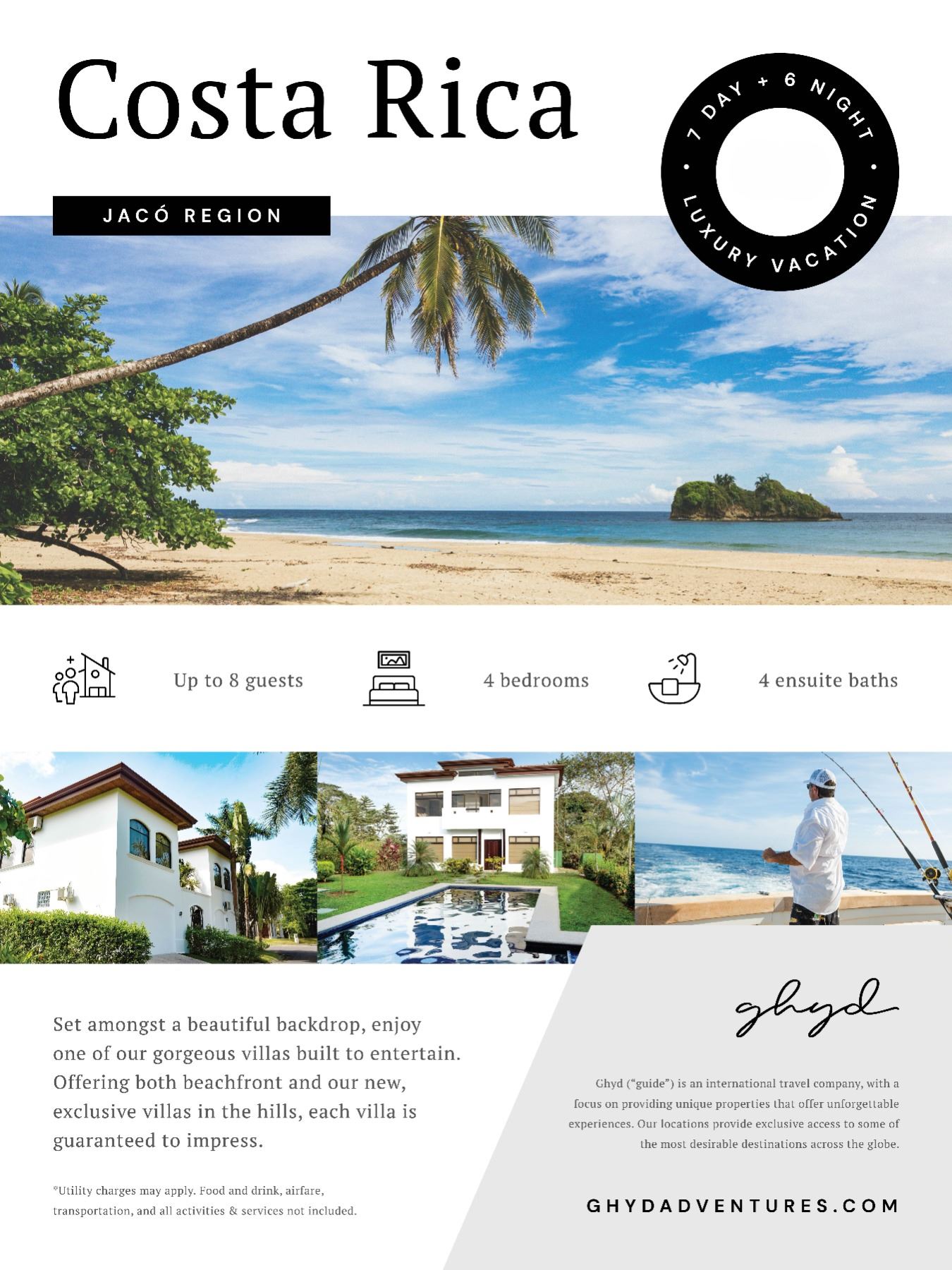 Enjoy 7 days / 6 nights in Costa Rica's Jaco region. Our properties offer the space and privacy in a style that fully embodies our luxury standard. Each villa has a private pool, pristine outdoor living space, and a breathtaking villa. Offering a private, beachfront community, each villa is guaranteed to impress. We offer 24/7 on-site full-service concierge, a trip planning specialist, custom itinerary, and special offers and unique experiences only offered to Ghyd guests. Trip expires 18 months from date of purchase. Includes villa stay only. All transportation, meals, activities, etc. are not included.