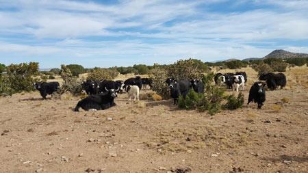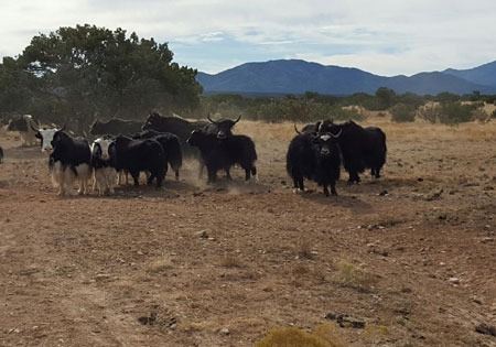 Near the Ortiz Mountains of New Mexico reside a large herd of North American Bison and Himalayan Highland Cattle also known as Himalayan Exotic Yak, Tibetan Bison or the “Grunting Ox”. This classic, old-world appearance is due to their high, humped shoulders, horse-like tails and long skirts of hair that hang down their sides to the ground. Their short legs have broad hooves and large dewclaws to help them maneuver over steep mountainous terrain.