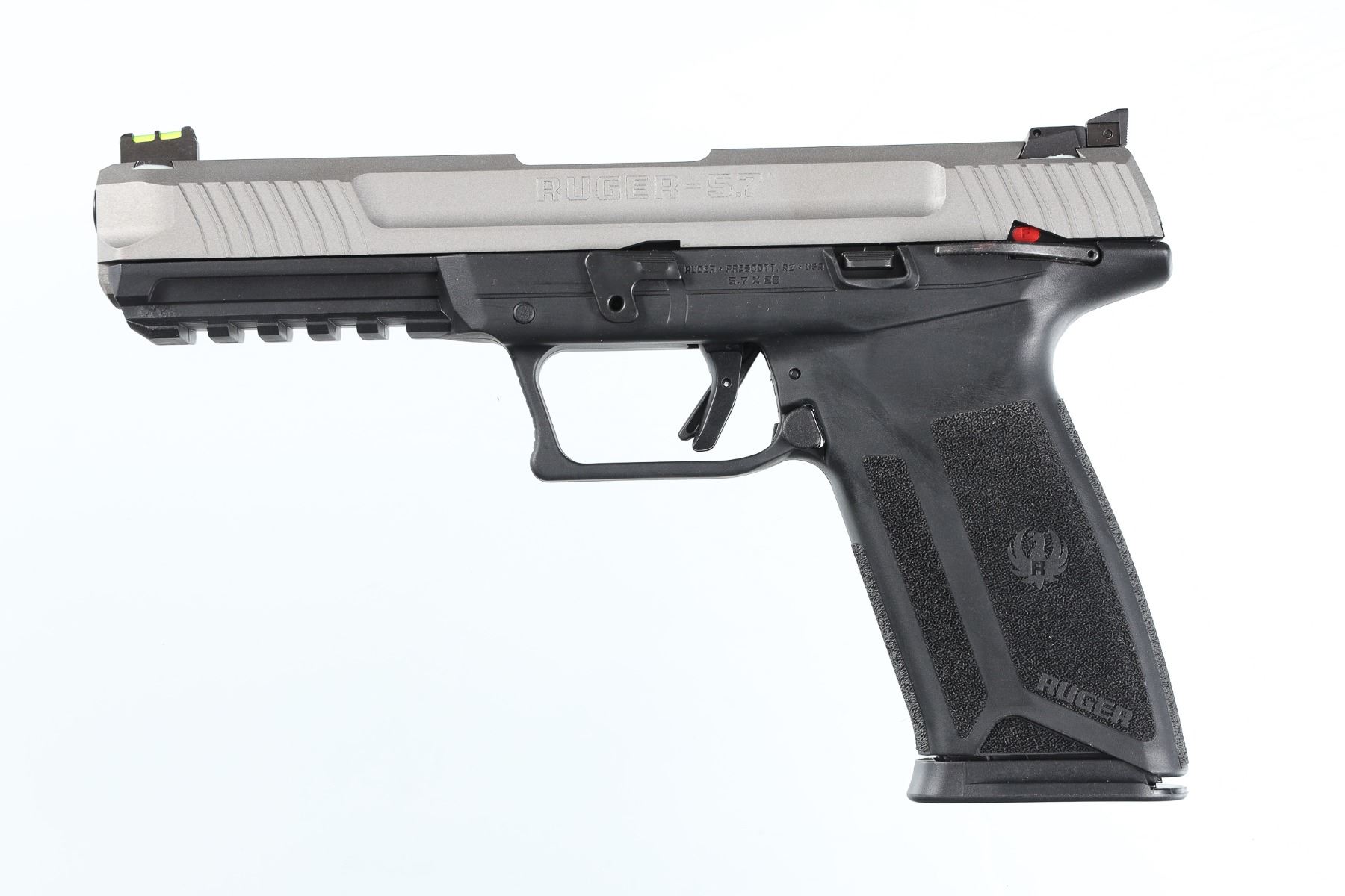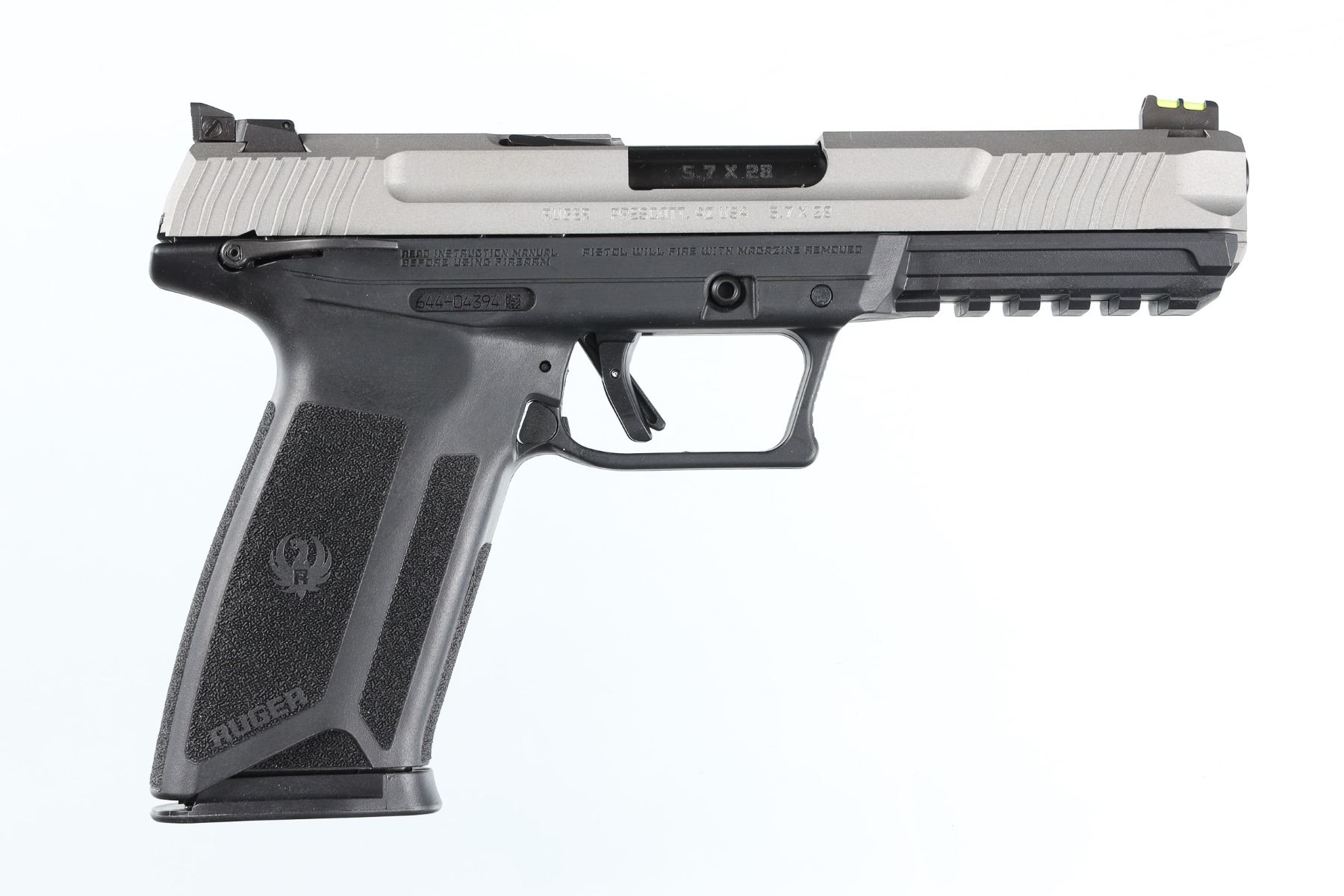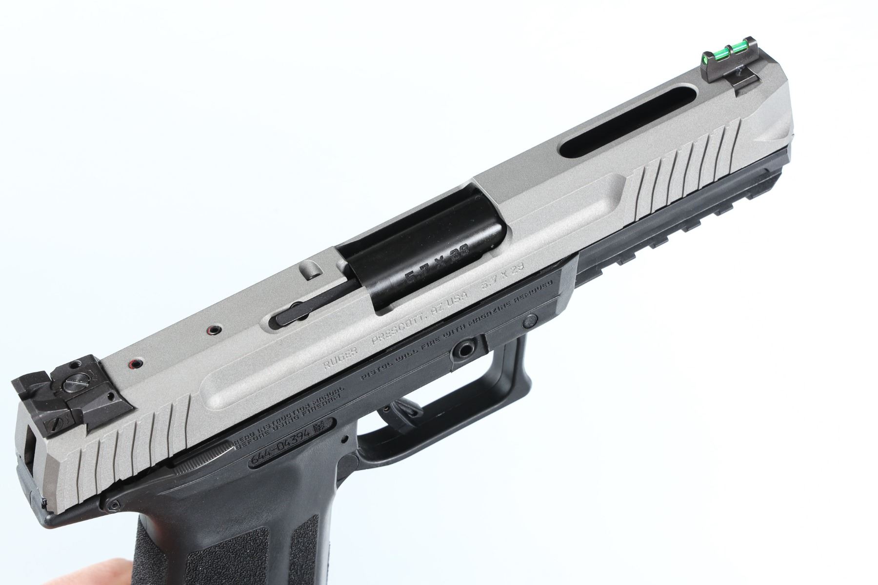 5.7x28mm Serial # 644-04394 Ruger 5.7 pisttol with 5" Bbl and silver cerokote finish Fiber optic front sight and 20 round magazine. Manual safety and adjustable sights. In factory box with all paperwork with spare magazine. Pistol remains as new unfired Barrel 5" Modern