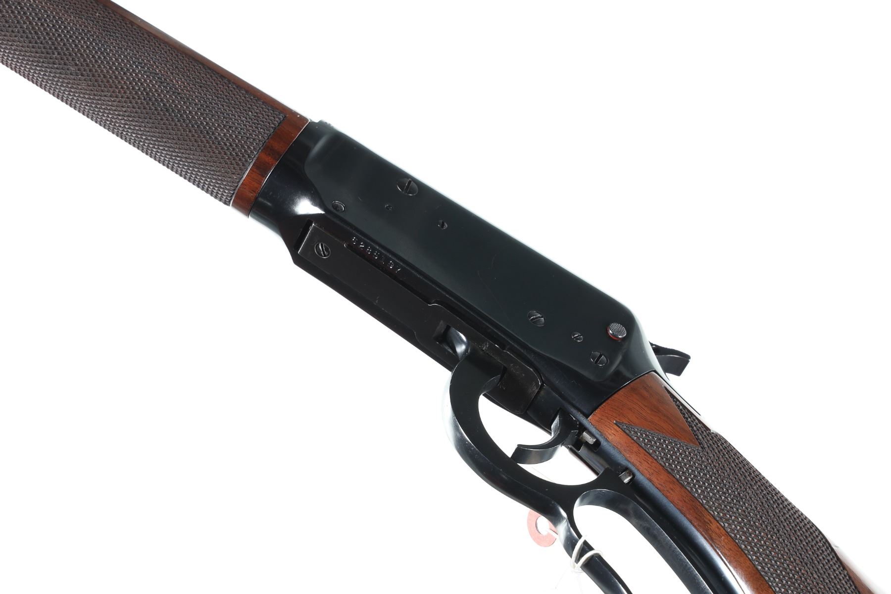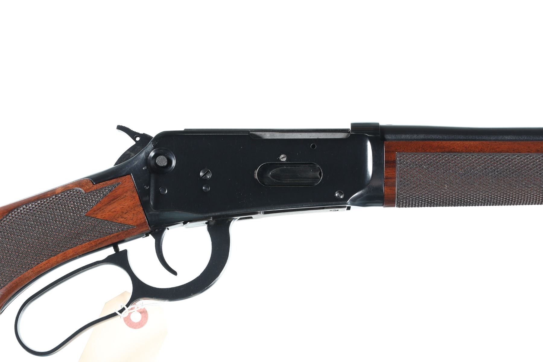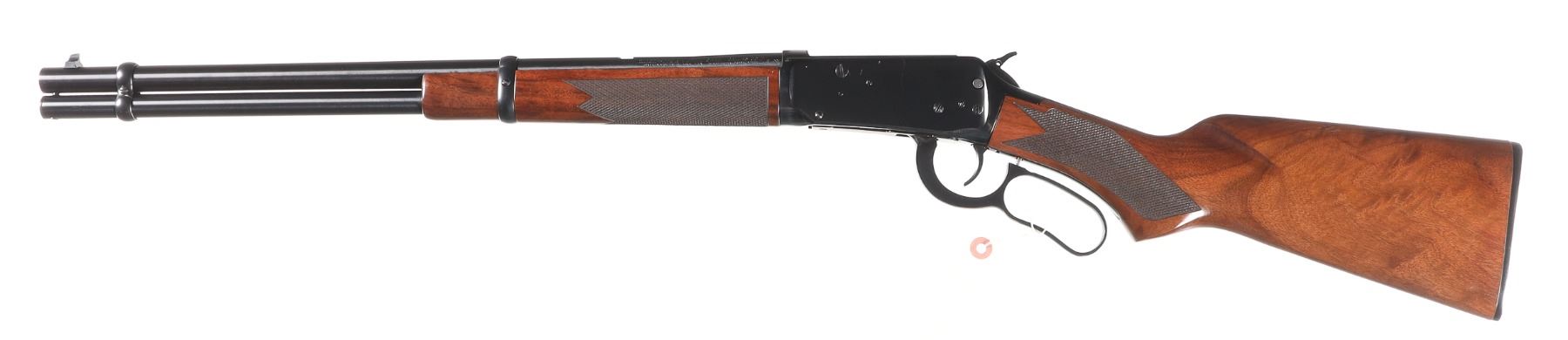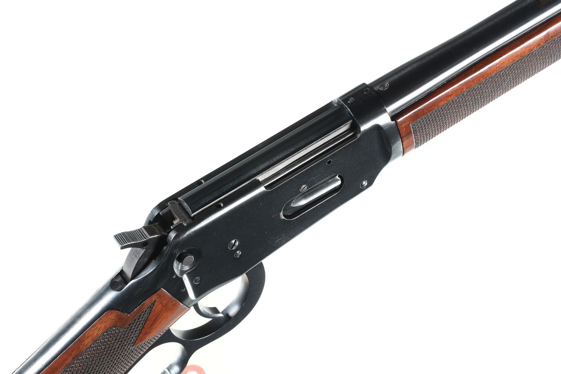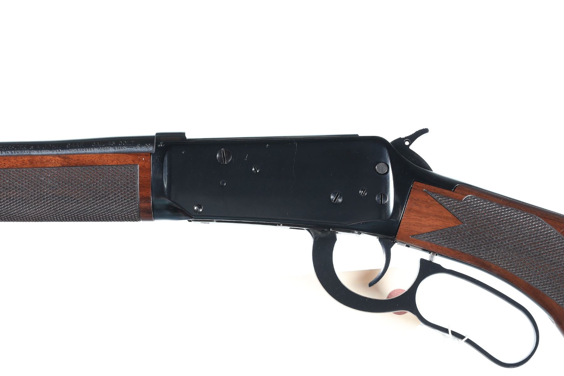 .45 Long Colt Serial # 6285197 Winchester 94 Angle Eject rifle with deluxe varnished , checkered stocks. 456 Colt Cal, Condition, Very fine with light use and bright bore Mechanically excellent. Rear sight absent. Barrel 20" 1994 Modern