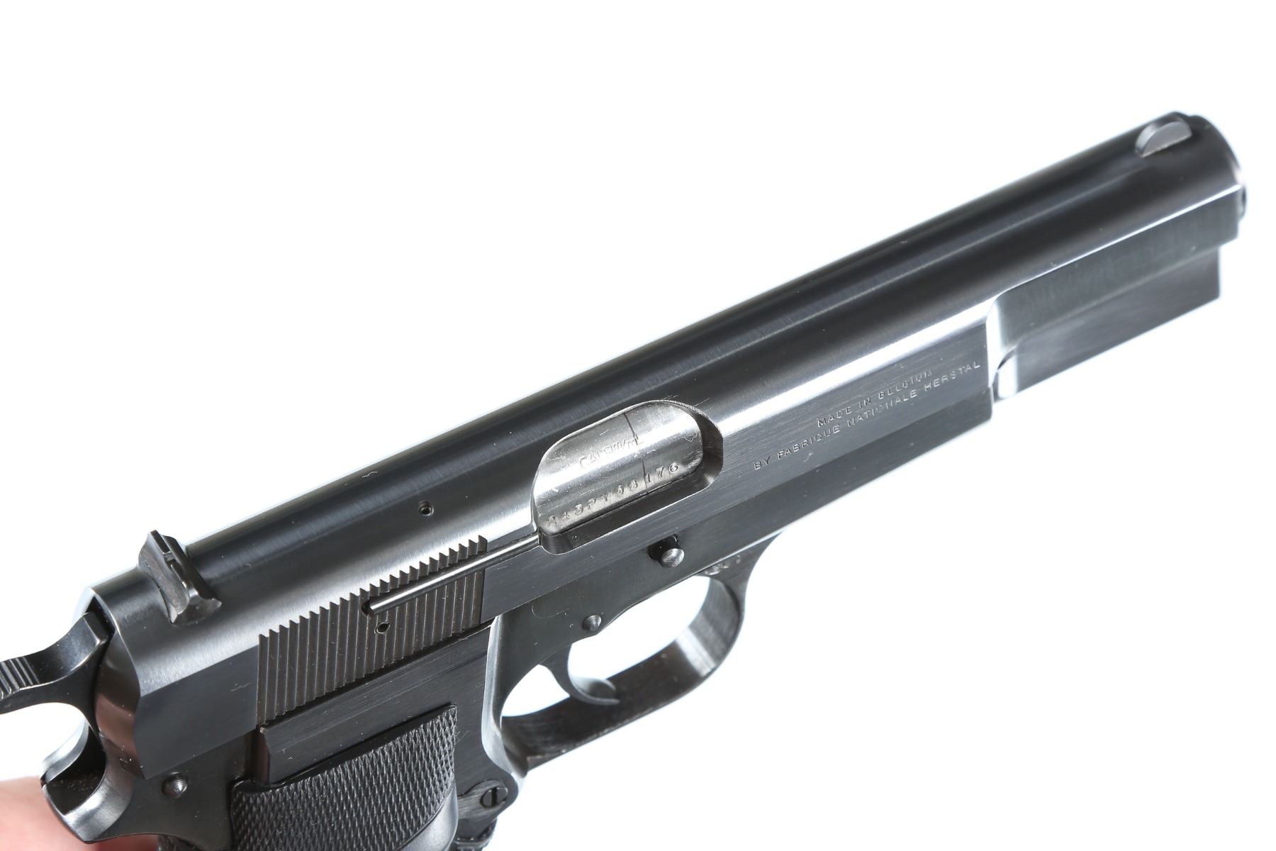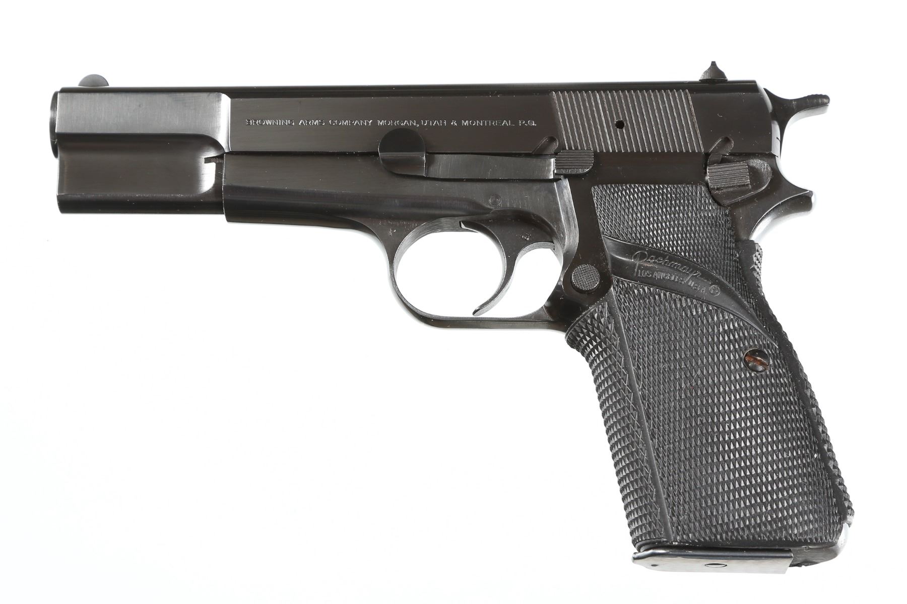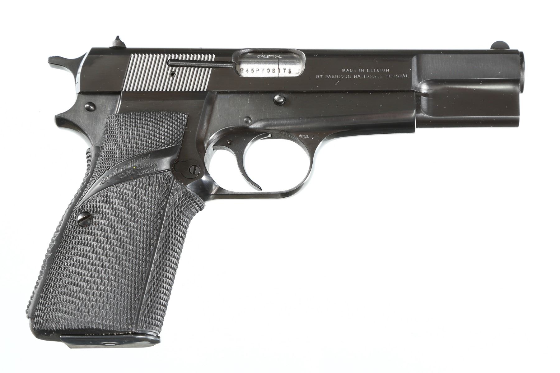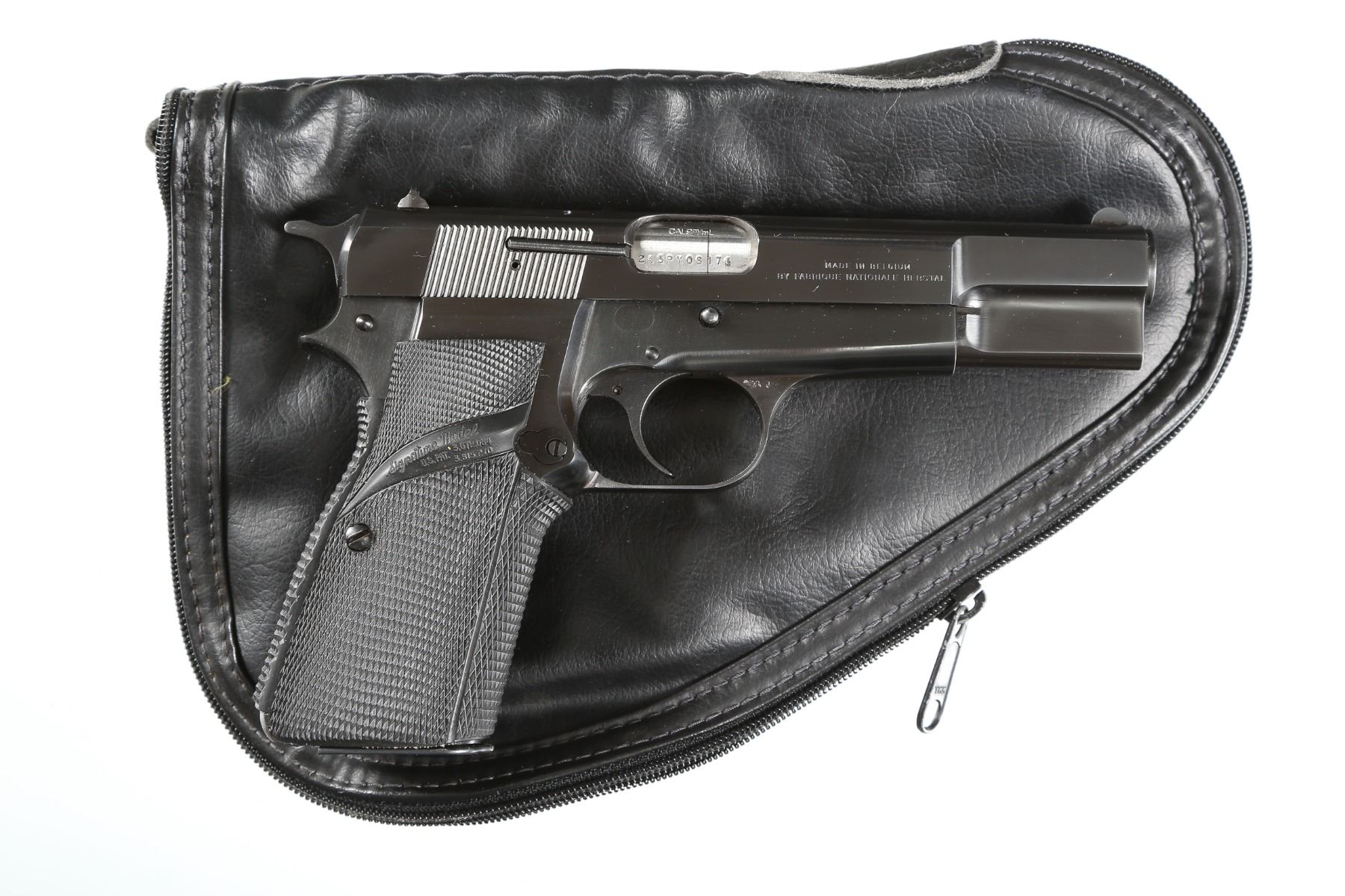 9mm Serial # 245PY08176 Browning Made in Belgium High Power 9mm pistol with blue finish, fixed sights, 13 round magazine and Browning zipper case Mfg. 1982. Condition Very fine with over 99% blue finish remaining with bright bore and mechanically excellent. Barrel 4 3/4" Modern